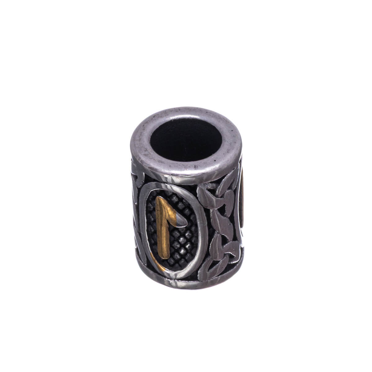 Tämän partakorun keskiössä on soikeaan kehykseen suljettu riimusymboli, joka edustaa koottua voimaa, suojaa ja mielen hallintaa. Muoto viittaa sinettiin tai kilpeen: merkkiin, jota ei jätetä avoimeksi, vaan joka varjelee kantajaansa. Riimua ympäröivä punottu ornamentiikka symboloi jatkuvuutta ja esi-isien perintöä – voimaa, joka on syntynyt ajassa ja kokemuksessa. Hienovarainen kullanvärinen yksityiskohta korostaa merkin ydintä ja viittaa arvokkuuteen, sisäiseen auktoriteettiin ja hiljaiseen johtajuuteen.