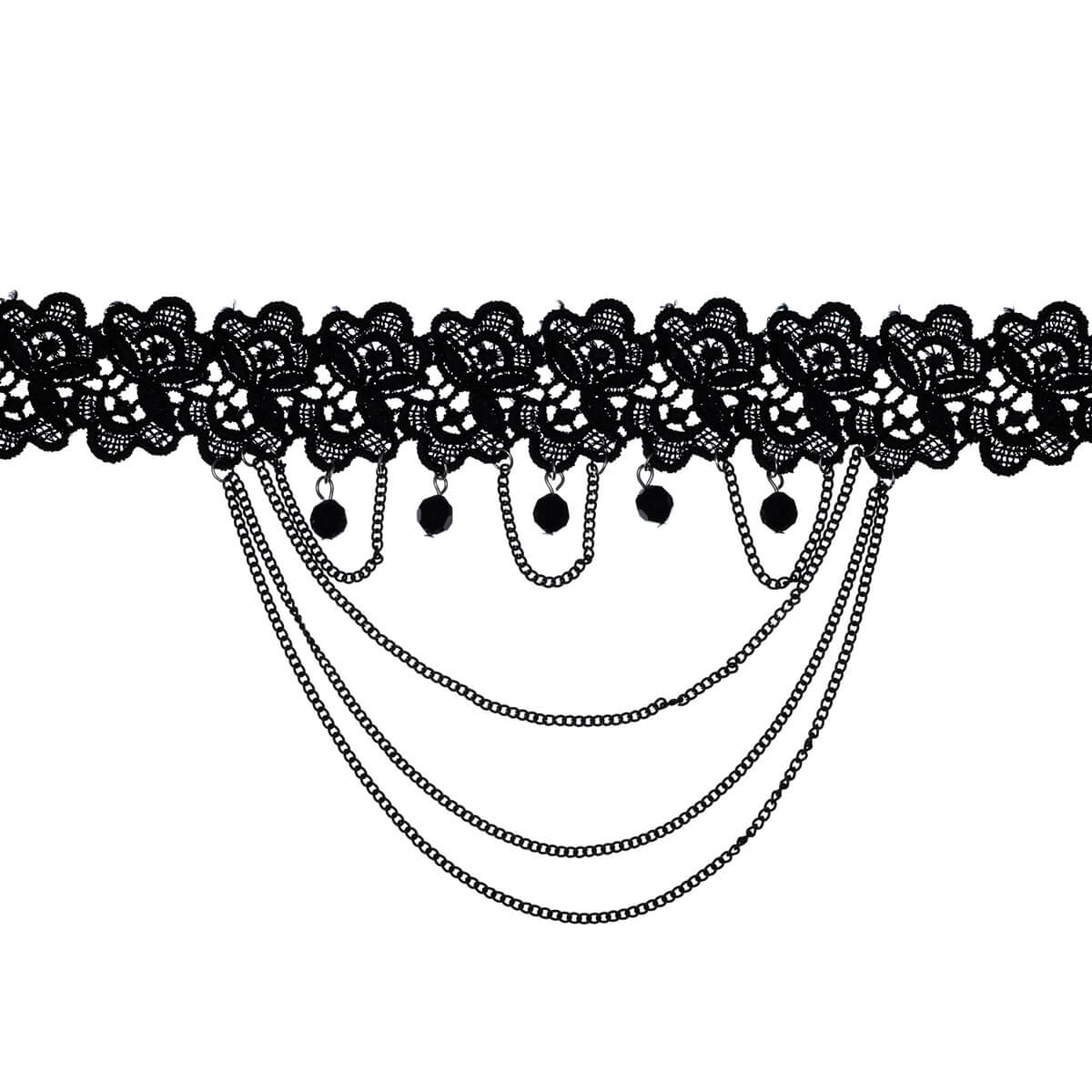 Goottityylinen kaulakoru on koristeltu mustalla ketjulla ja mustilla viisteisillä lasihelmillä. Pitsikaulakoru on leveä ja ketjut tippuvat tästä alemmaksi. Goottihenkinen kaulakoru sopii mainiosti myös juhlakäyttöön.