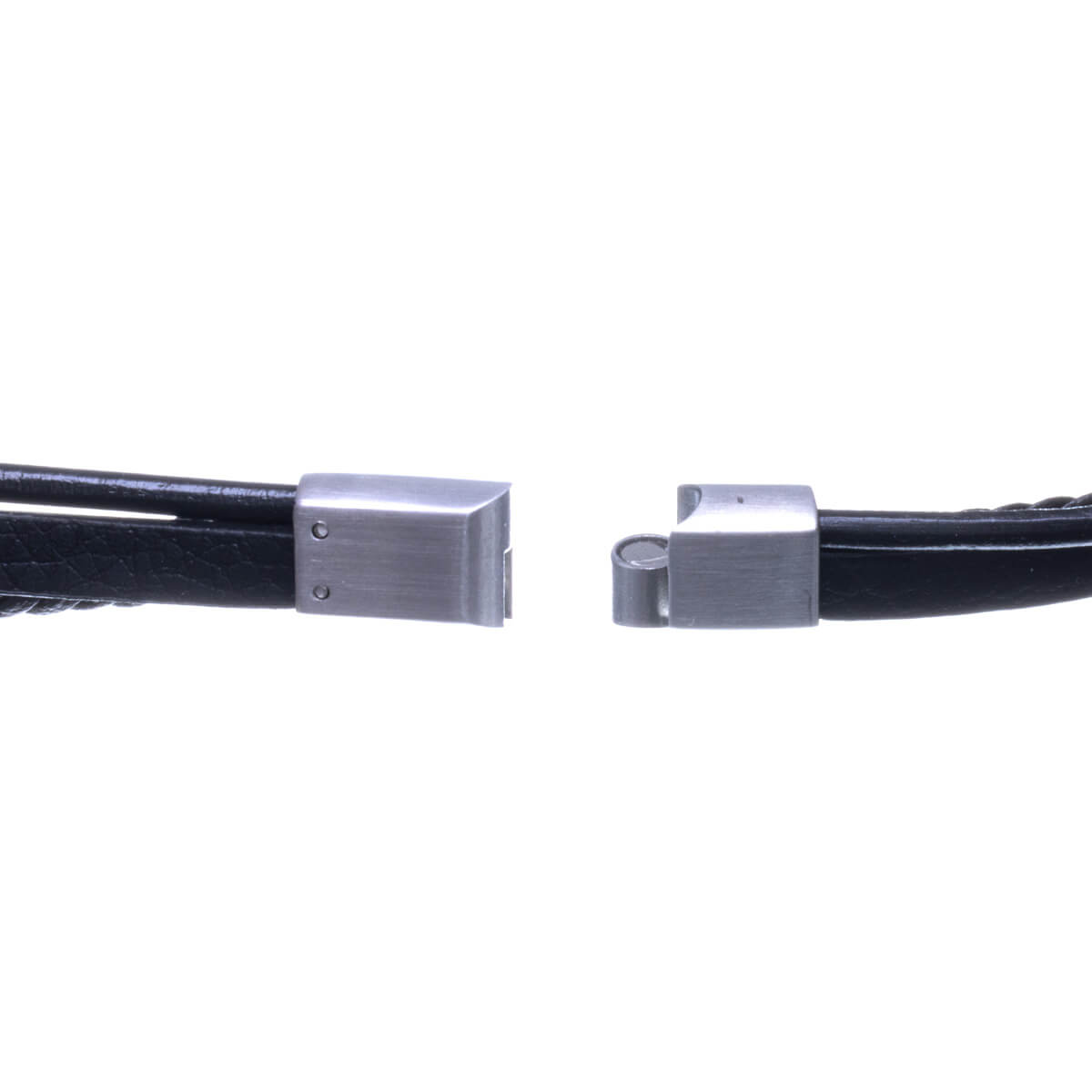Kolmerivinen rannekoru koostuu keinonahka remmeistä, mistä yksi on koristeltu teräksisellä laatalla. Harjattu teräksinen lukko on vahvistettu magneetilla.