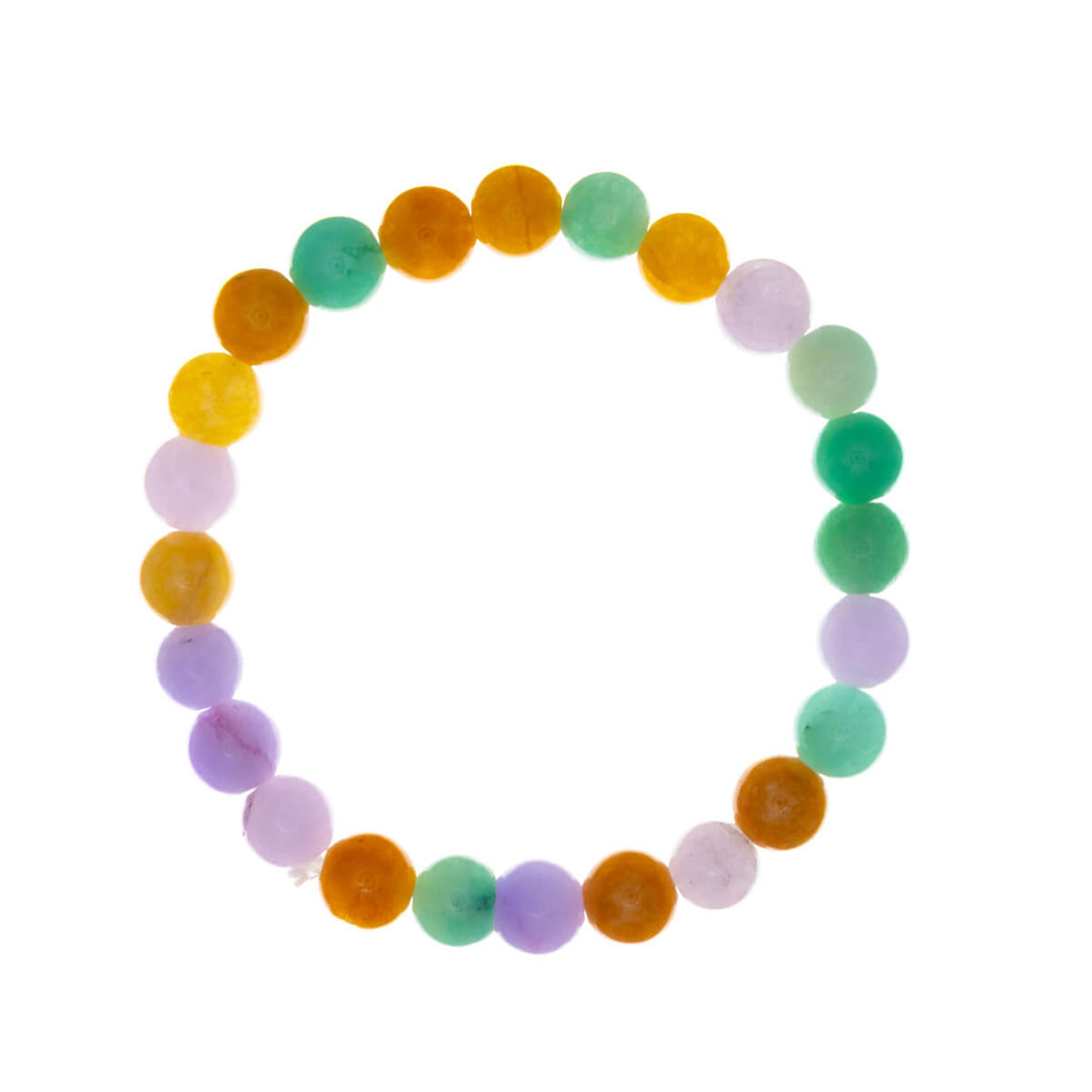 Värikkäät kivihelmet sopivat monen asun kanssa. Joustava silikoninauha ei tarvitse erillistä lukkoa vaan rannekoru pujotetaan ranteeseen.