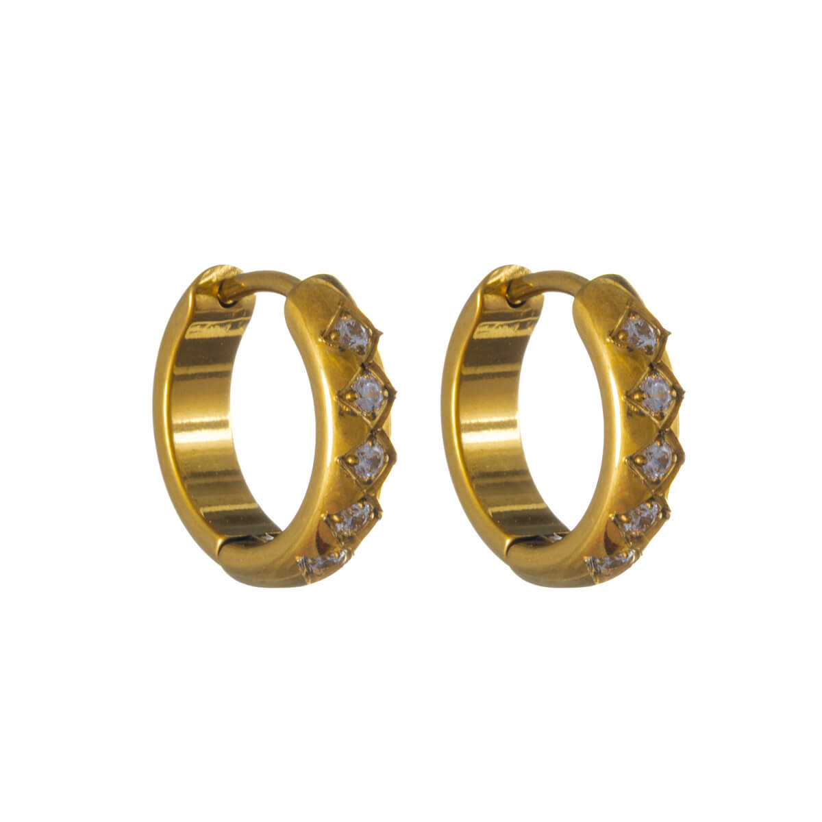 Korvarenkaan etuosaa koristaa viisi kirkasta zirkoniakiveä, jotka on asetettu näyttävästi vinoneliön muotoisiin kehyksiin. Kuvioitu kiviasettelu antaa korulle hienostuneen ilmeen ja tuo siihen eleganttia säihkettä ilman liiallista näyttävyyttä.