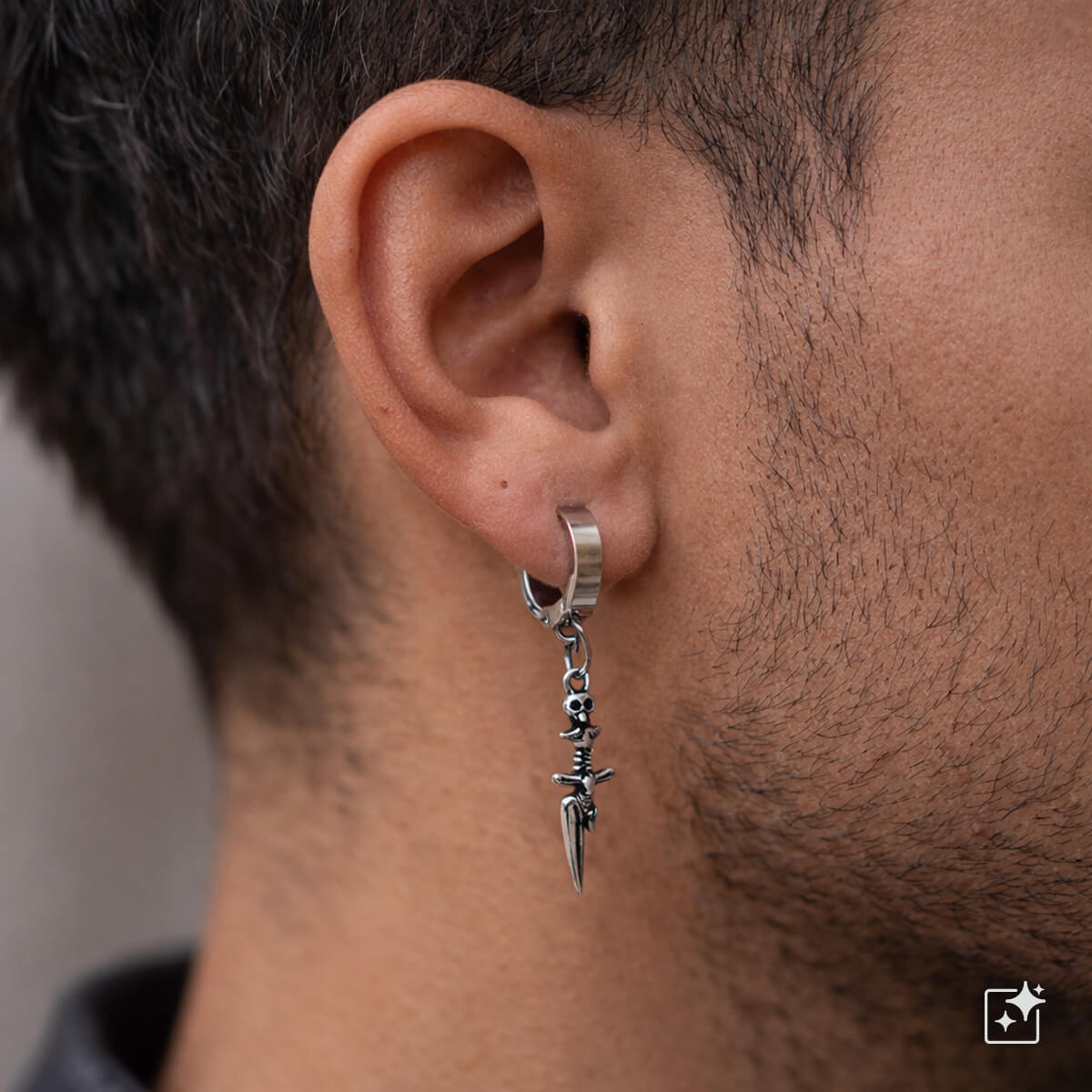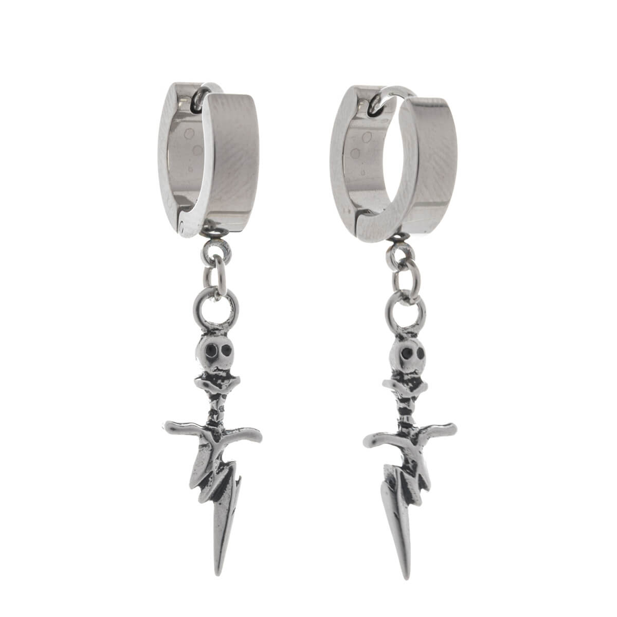 Näyttävät tikari-riipukselliset korvarenkaat, joissa yksityiskohdat tekevät mallista erityisen. Tikari muodostaa salaman muodon ja tupen päässä oleva pääkallo tuo koruun tumman, vaihtoehtoisen ilmeen. Kokonaisuus on tasapainoinen: sopivan kokoinen arkikäyttöön, mutta tarpeeksi rohkea erottuakseen.