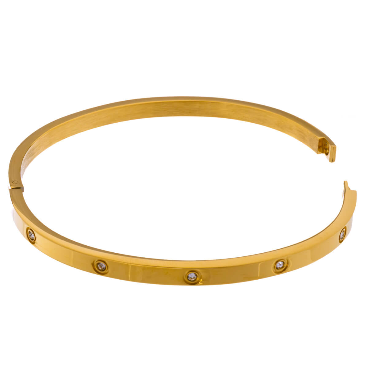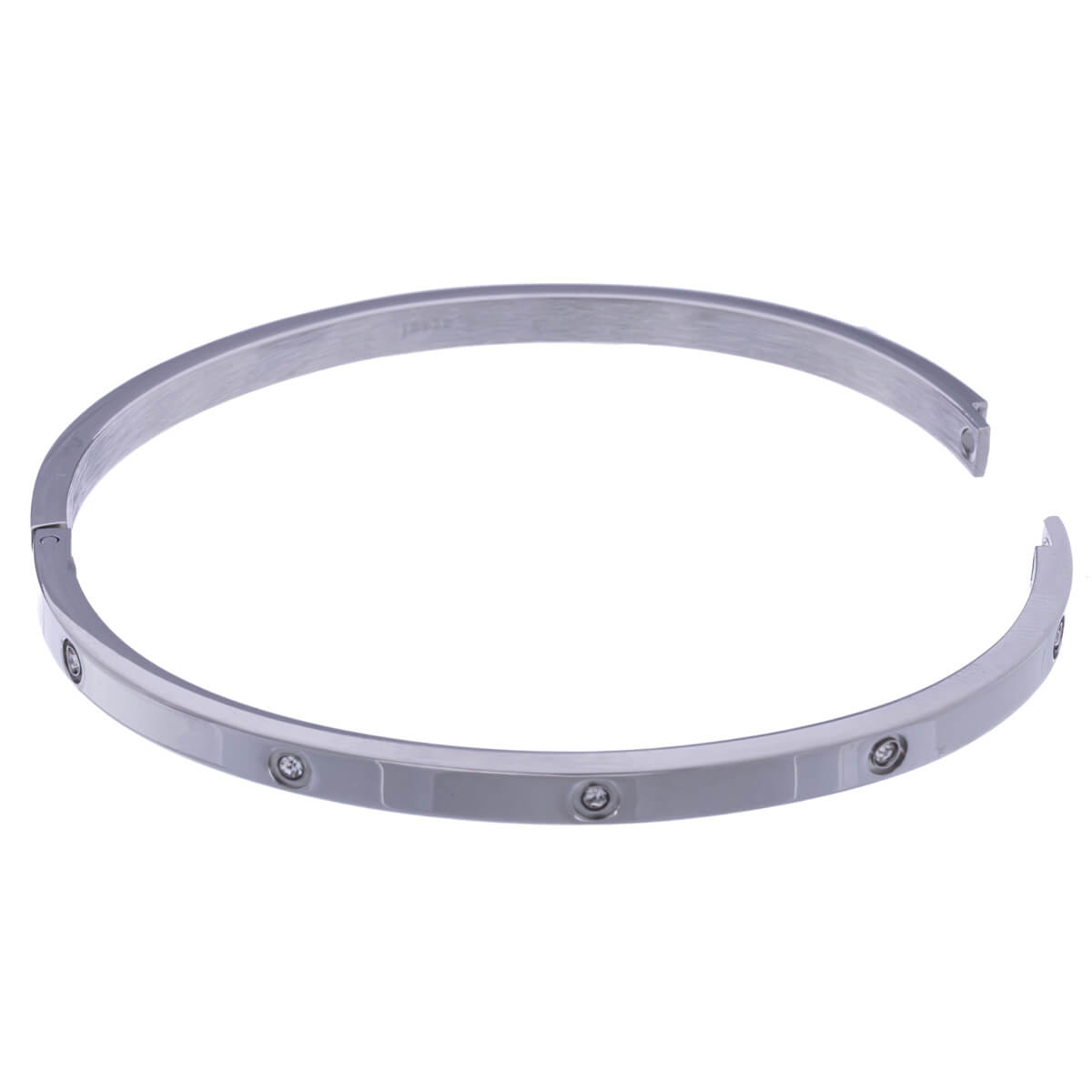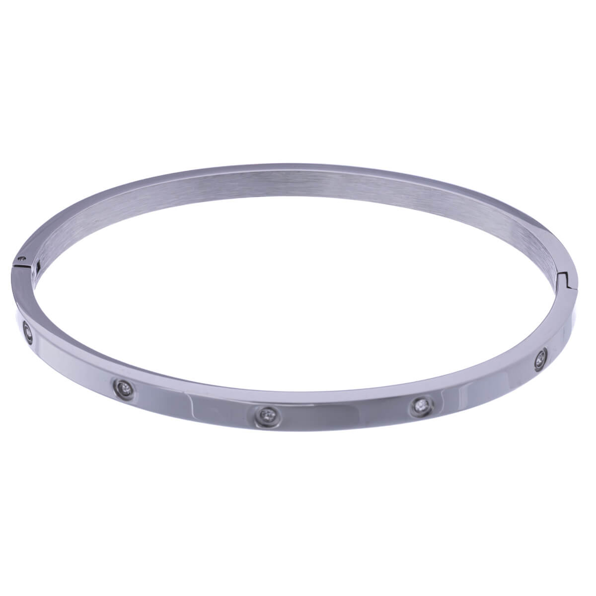 This steel bracelet wraps around the entire wrist and is a striking yet minimalist piece. The outer surface of the bracelet is smooth and decorated with ten zirconia stones. The ten zirconia stones are evenly spaced around the entire outer surface of the bracelet. The bracelet opens easily with a hinge on one side.