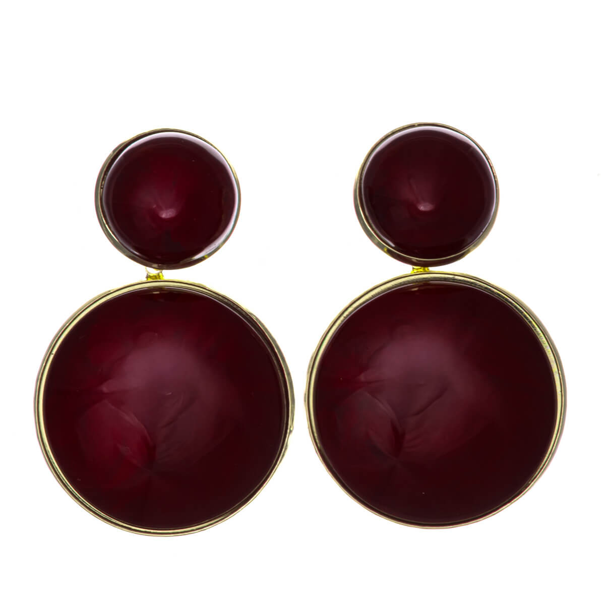 These dark red round earrings are sure to add color to your outfit. The gold-colored frame goes perfectly with the dark red.