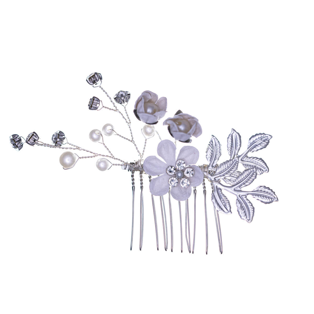 1. Flower hair accessory with comb – a more eye-catching hair accessory with one metal flower, two paper flowers, sparkling glass stones, and pearls. Easy to attach to a comb with the attached structure.