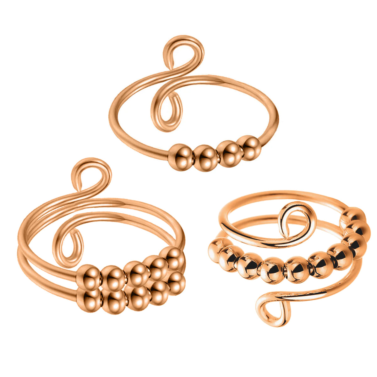 The set includes three different stress rings with varying numbers and sizes of beads. The rings are pleasantly light, durable, and adjustable to fit your finger perfectly.