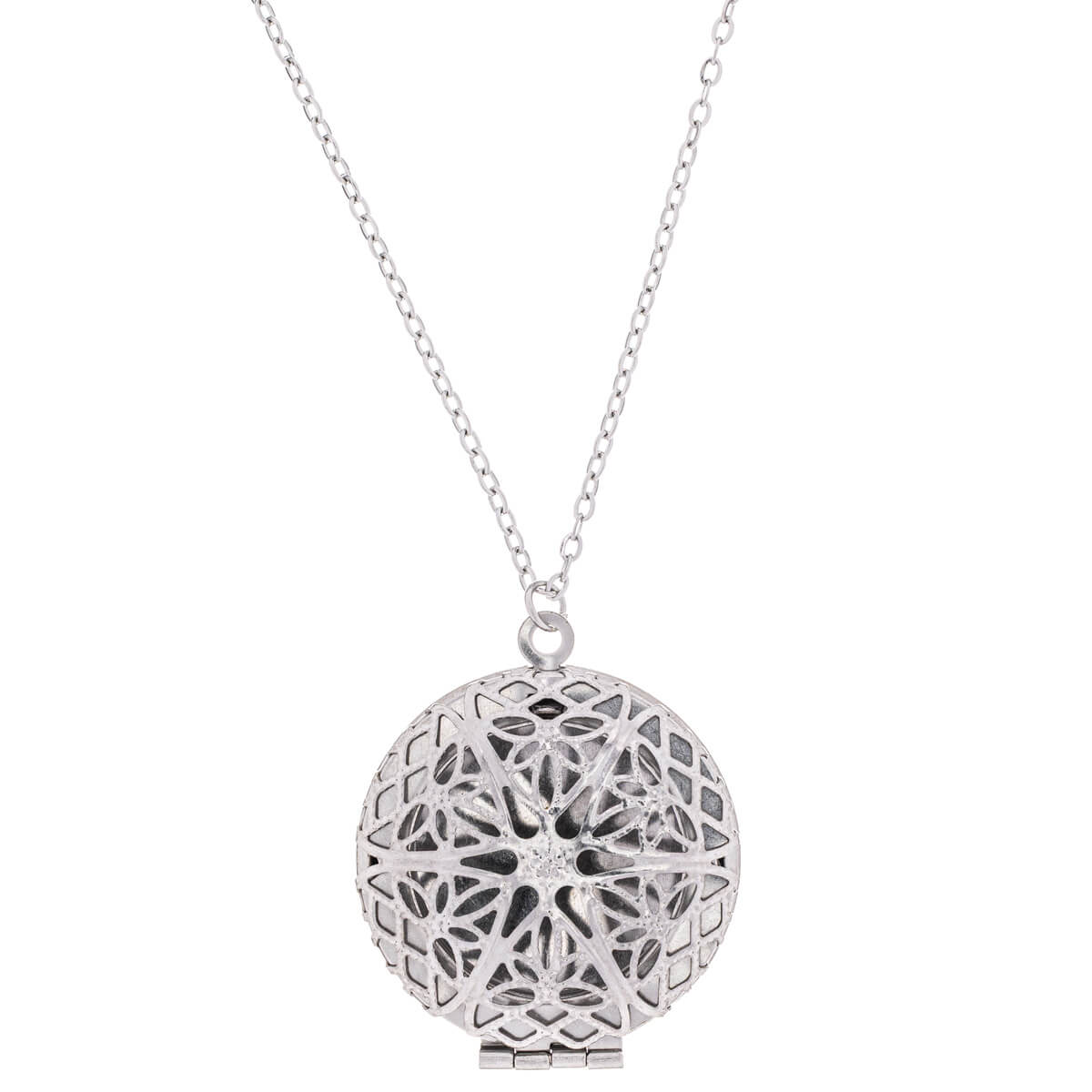 This steel necklace is wonderful because the material does not wear out. The medallion necklace is the perfect piece of jewelry for yourself or as a gift. The round medallion opens at the top in this model, meaning that the hinge is at the bottom of the pendant. The openings in the shell design make it partially transparent. Steel does not wear out with use.