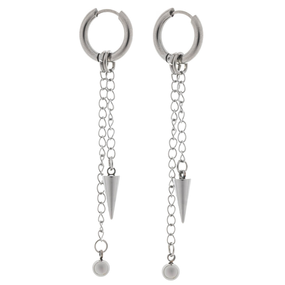 Stylish surgical steel earrings with a two-level chain structure that creates striking movement. The steel ball and pointed spike hanging from the ends of the chains create a balanced contrast – round and sharp in the same piece of jewelry.
