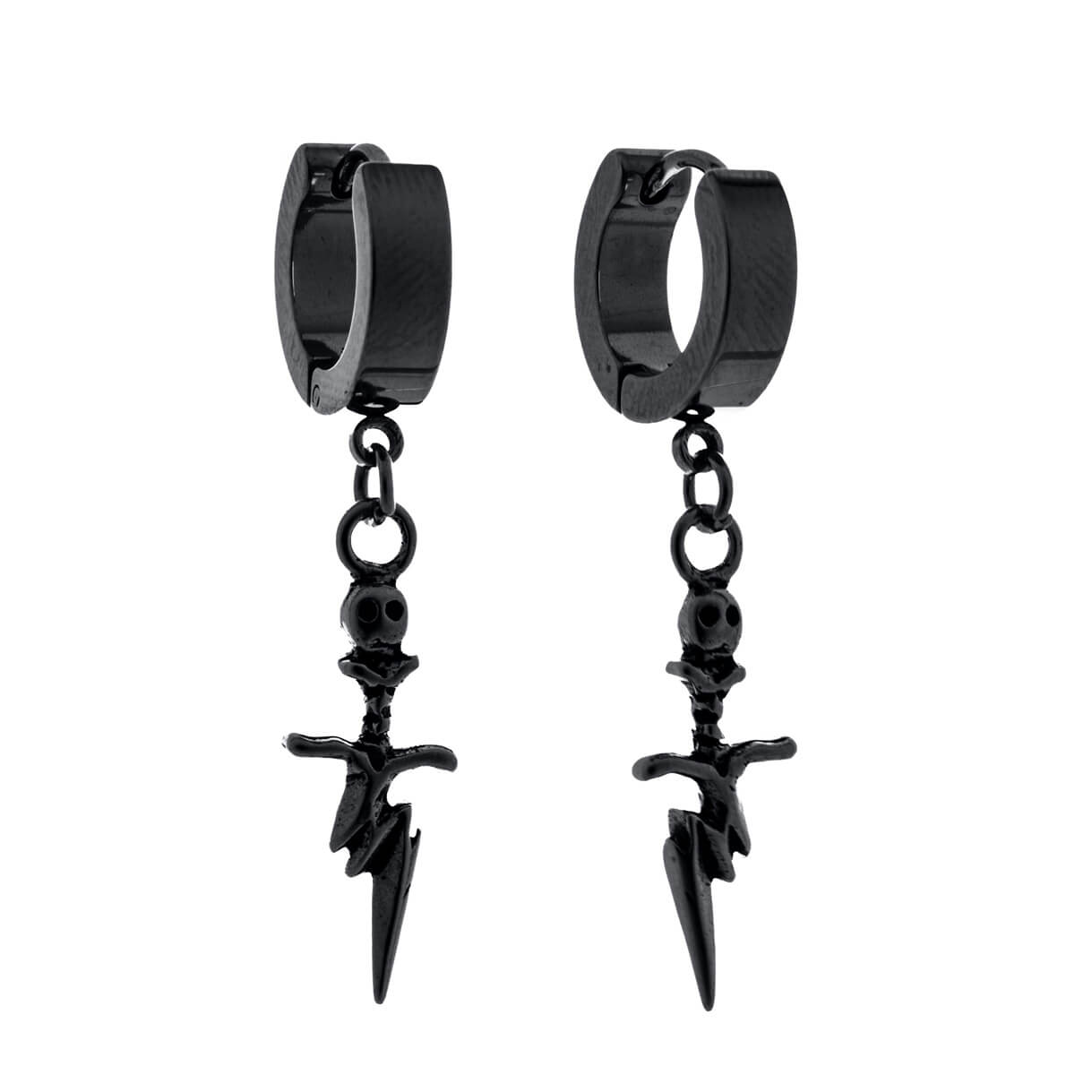 Striking dagger-pendant earrings with details that make this design truly unique. The dagger forms a lightning bolt shape, and the skull at the tip of the sheath gives the jewelry a dark, alternative look. The overall look is balanced: the right size for everyday wear, but bold enough to stand out.