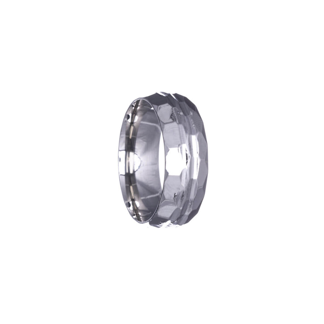 The sparkle in this ring comes from its many angles. There are two angled grooves in the centre of the ring and the sides of the ring are beveled. The numerous angles and polished steel make this ring a sparkling detail on the finger.