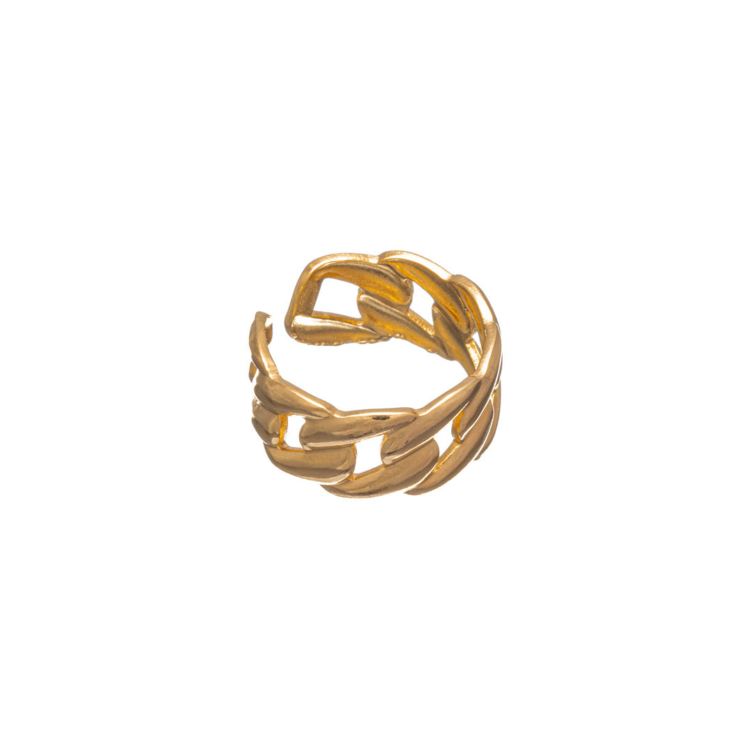 A flat chain pendant forms an elegant wide ring. This ring can be easily changed between fingers as it is adjustable. The one size fits all steel ring is easy and convenient.