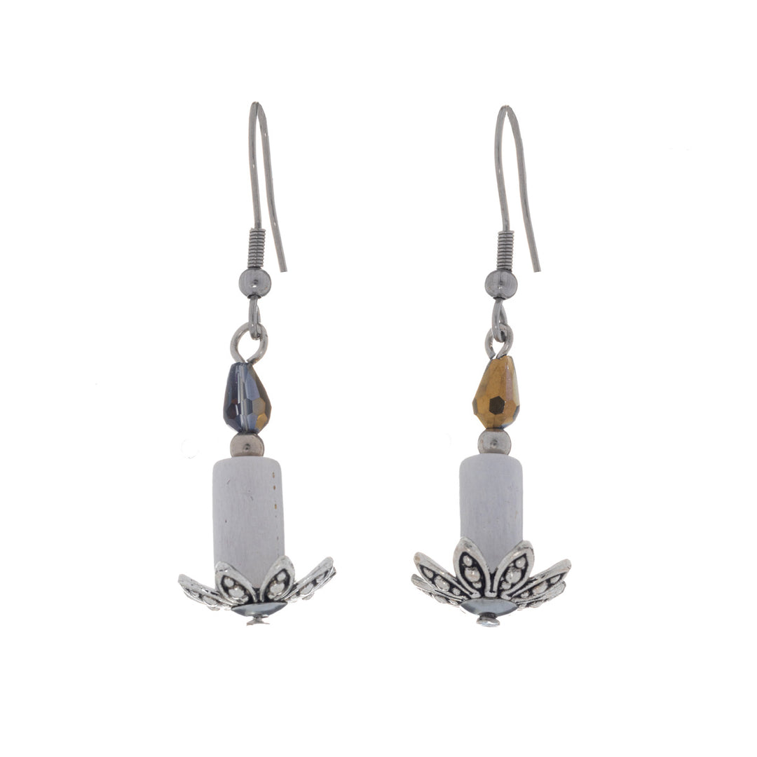 Kaunis siro adventtikynttilä korvakoru on yhdistelmä puuta ja lasia. Valkoinen puinen runko ja viisteinen lasihelmi kynttilän liekkinä luovat kauniin yhdistelmän.