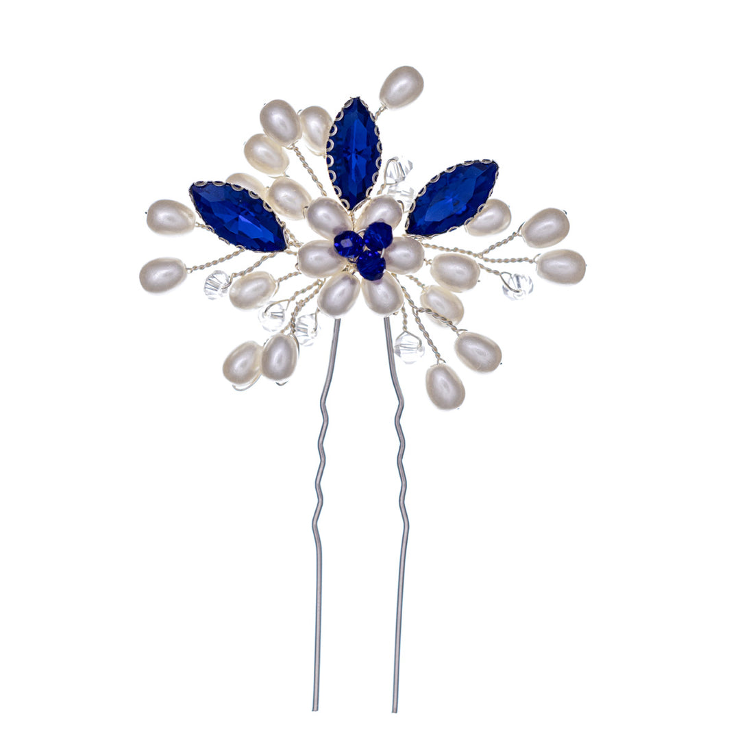 Sinisillä lasikivillä koristeltu hiuskoriste on kimaltava yksityiskohta kampauksessa. Hengettömän hiuskorun saa helposti kampaukseen.
