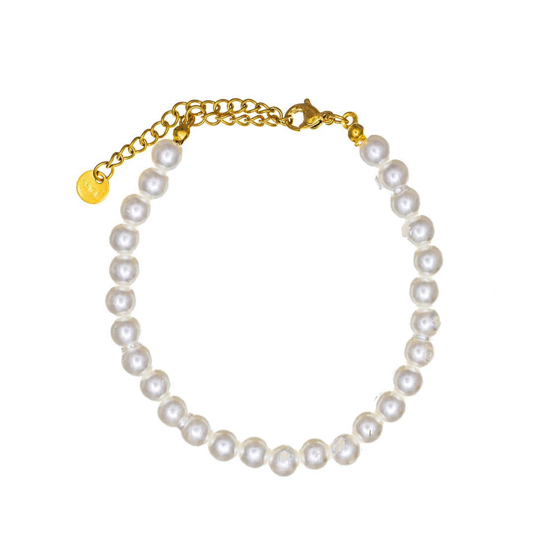 Yksirivinen helmirannekoru on helppo koru yksinään tai nipussa. Tässä mallissa muoviset helmet ovat pujotettu kahteen vahvaan puuvillanaruun. Metalliosat korussa ovat kirurginterästä.