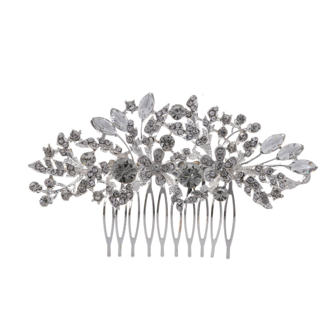Näyttävä hopeanvärinen hiuskoru on koristeltu kirkkain lasikivin. Kammallisen hiuskorun kiinnität helposti kampaukseen.