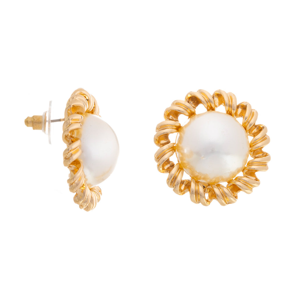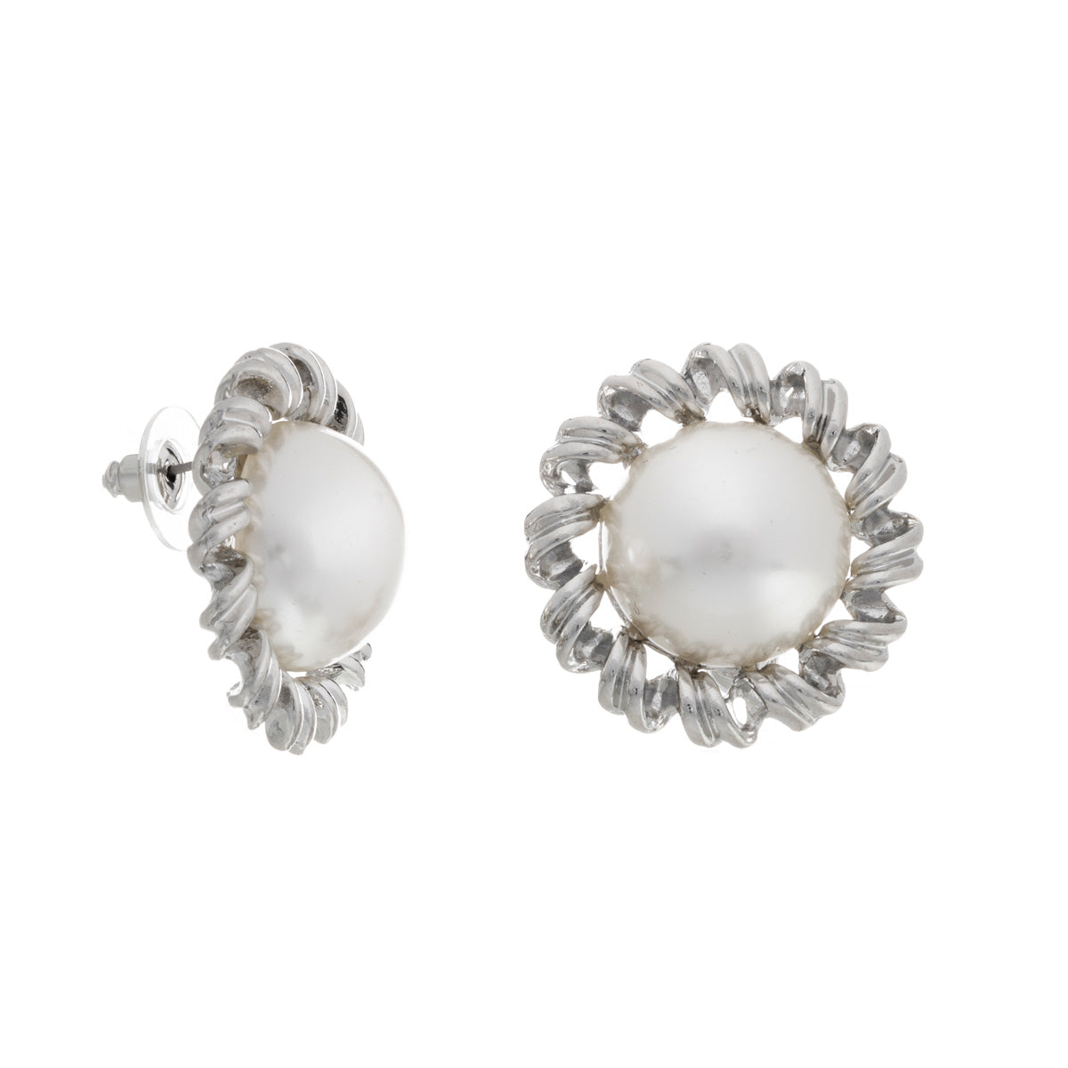 Isot helmi korvakorut ovat elegantit. Puolikkaan helmen ympärillä on metallinen kierre koristeena.