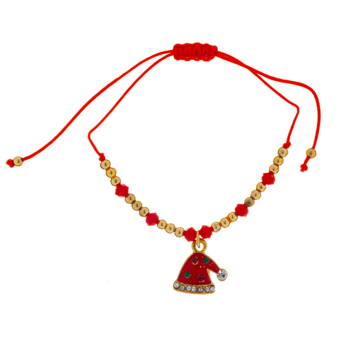 Ohueseen punaiseen naruun punotut punaiset viisteiset helmet kimaltelevat kauniisti. Minimalistinen rannekoru on helppo laittaa ranteeseen ja kiristää nauhoista tiukemmalle.