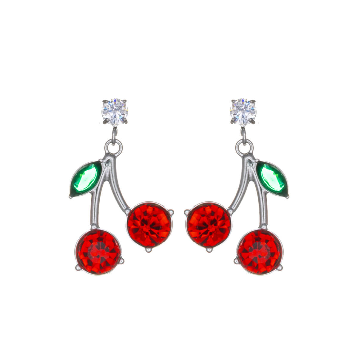 Roikkuvat kirsikkakorvakorut ovat trendikäs valinta asuusi. Tässä mallissa zirkonia kivestä roikkuva kirsikka on koristeltu vihreillä ja punaisilla lasikivillä. Teräksinen runko kestää käyttöä eikä kulu