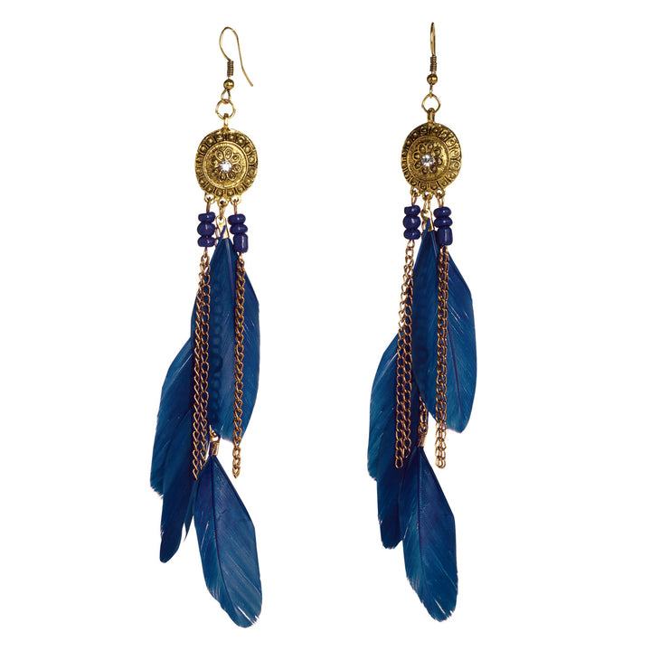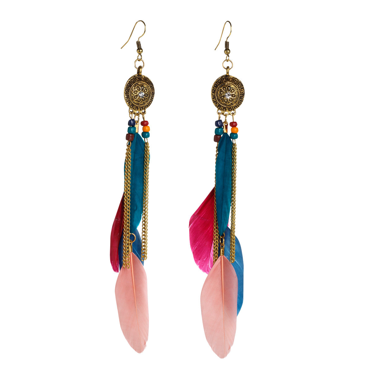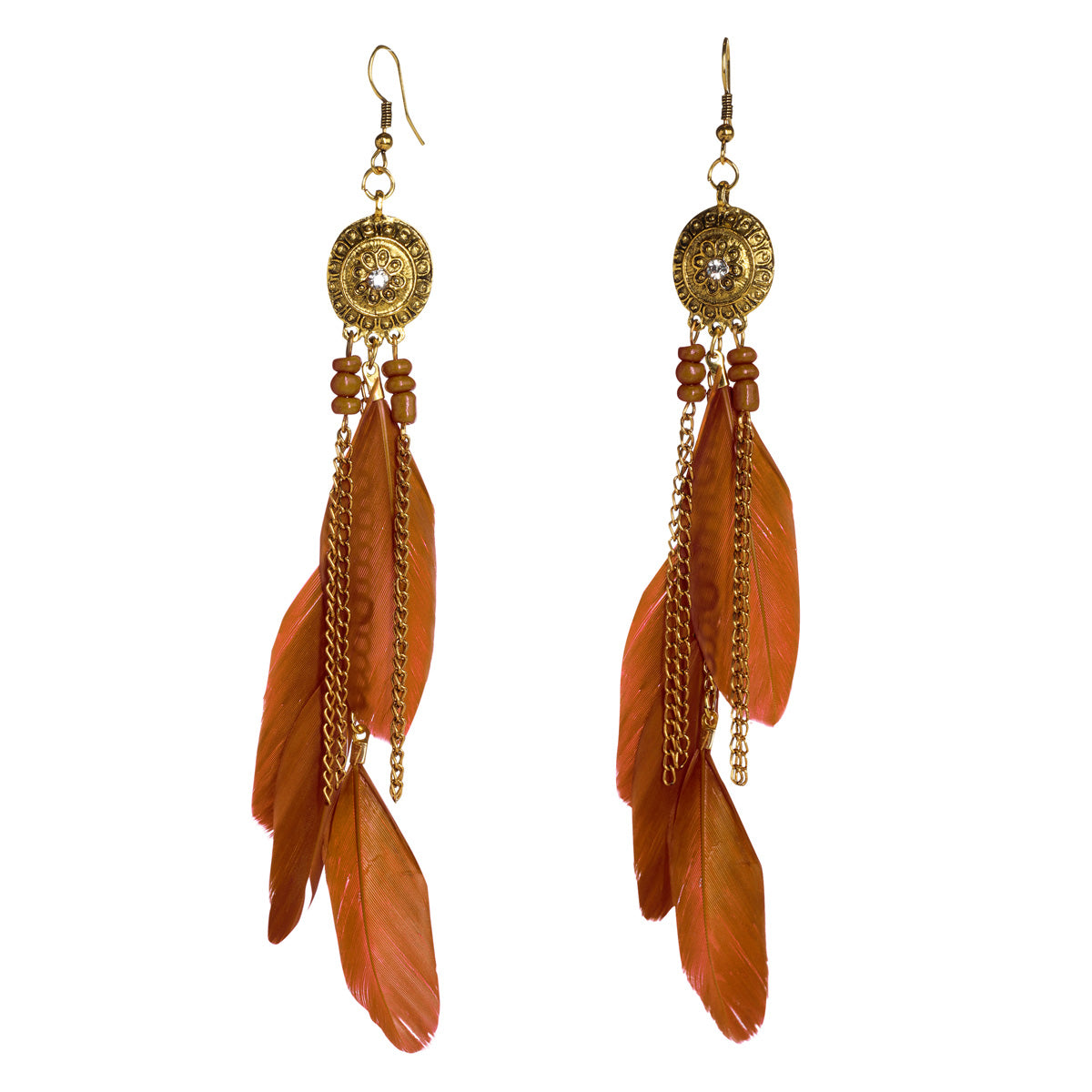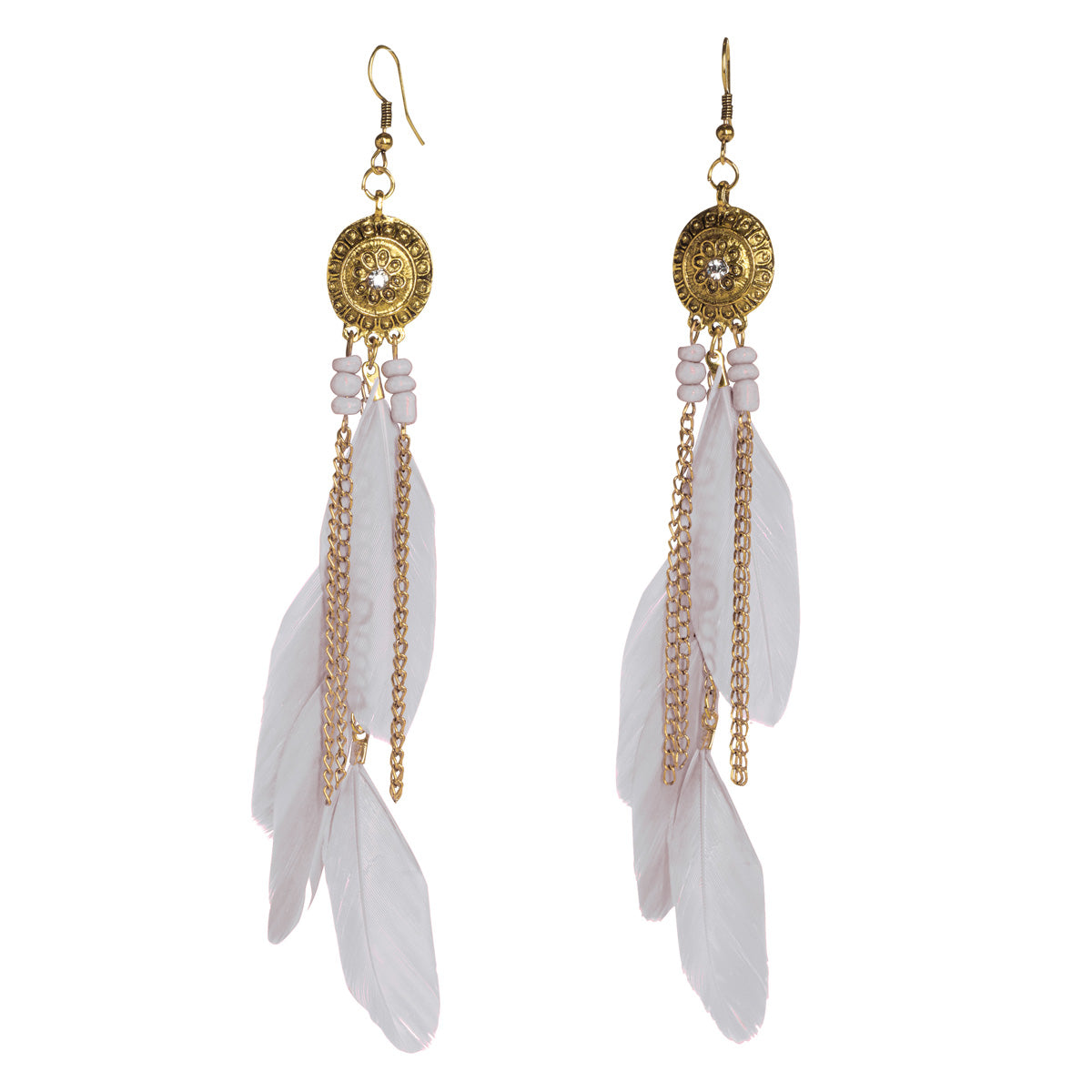 Koristeelliset pitkät sulkakorvakorut ovat todella näyttävät. Antiikinkullanvärinen viimeistely antaa metalliosille kauniin yksityiskohdan.