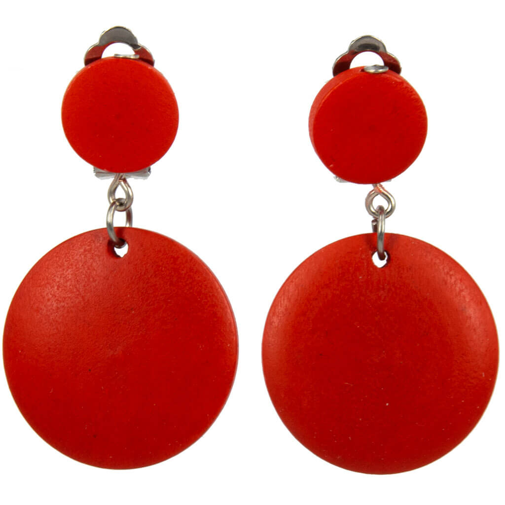 Materiaalina puu on kevyt ja luonnollinen. Tässä klipsikorvakorussa klipsimekanismin päällä on puinen lätkä, josta roikkuu puinen pyöreä isompi lätkä.