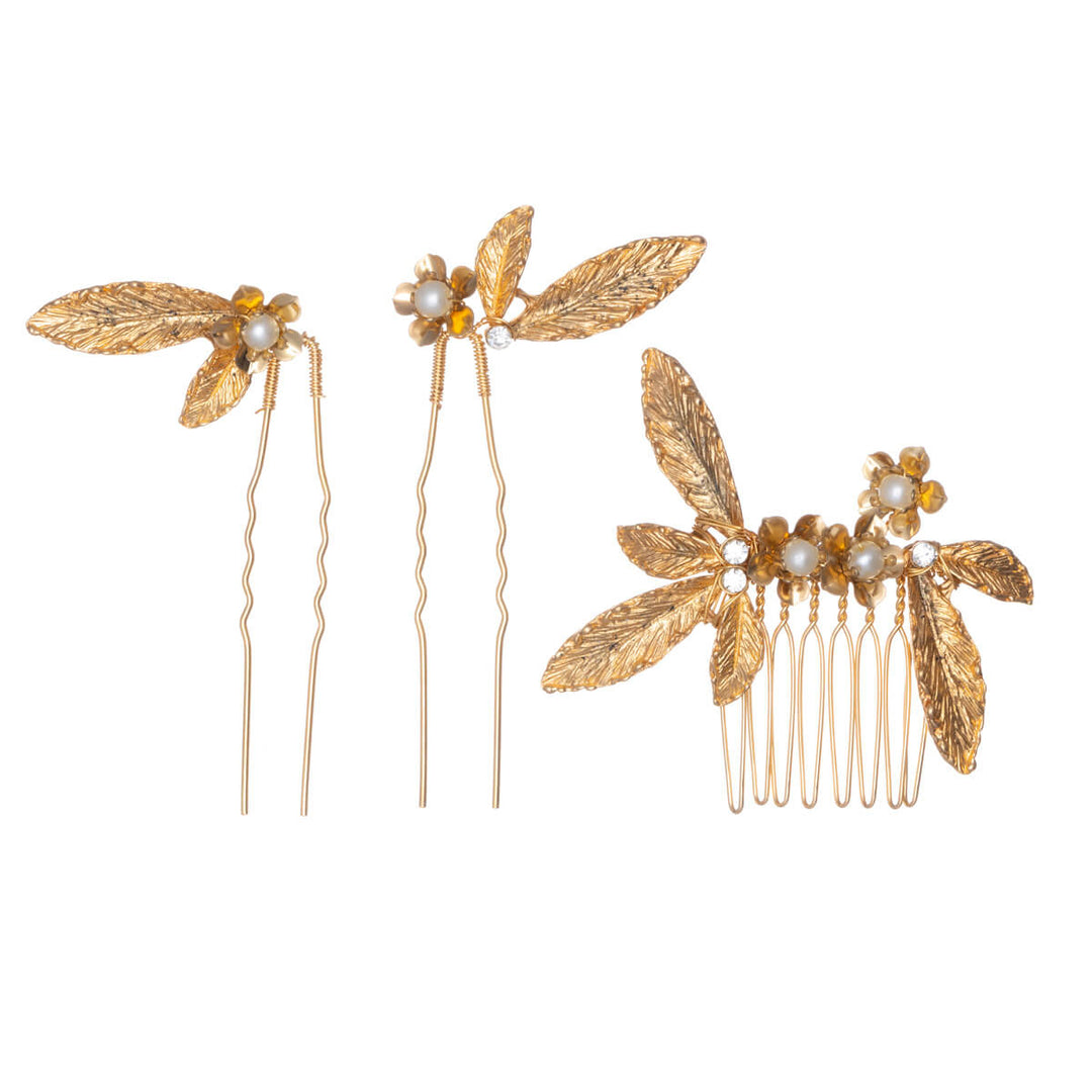 Trooppiset lehdet ja kukat koristavat tätä hiuskorusettiä. Hengettömän hiuskorun saa helposti kampaukseen.