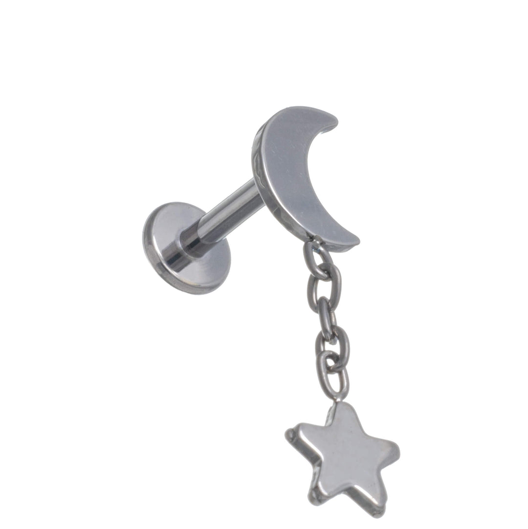 Puolikuu labret on koristeltu ketjusta roikkuvalla tähdellä. Koru on kokonaan kiillotettua titaania.