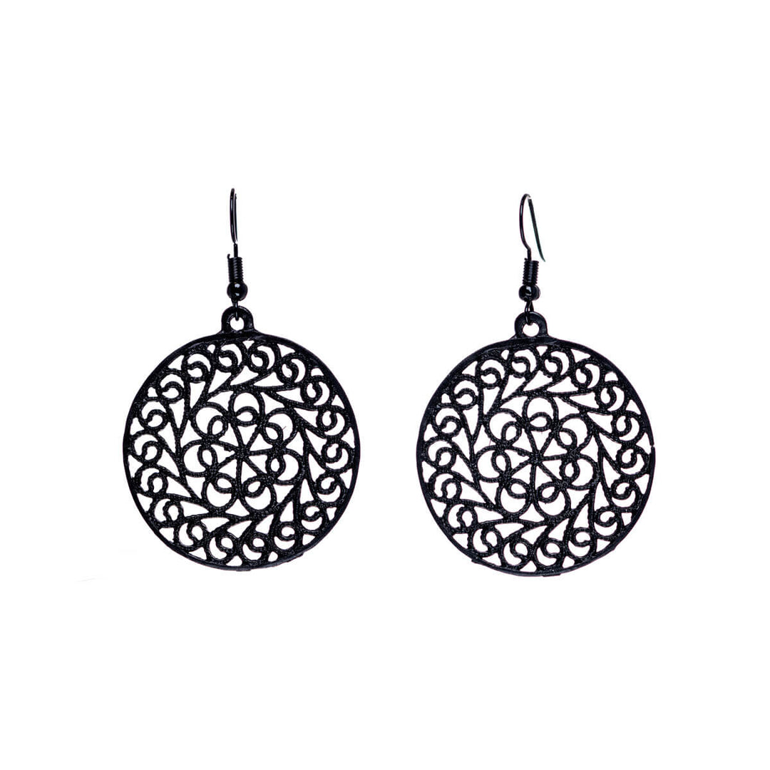 Musta on monelle se ainoa väri. Tässä korvakorussa on todellakin mustaa. Kuvioidut pyöreät korvakorut ovat kauniin boheemit.