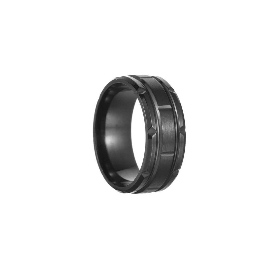 Musta viisteinen sormus on hyvää vaihtelua perinteiselle tasaiselle sormukselle. Viisteiset urat antavat pienen yksityiskohdan korulle.