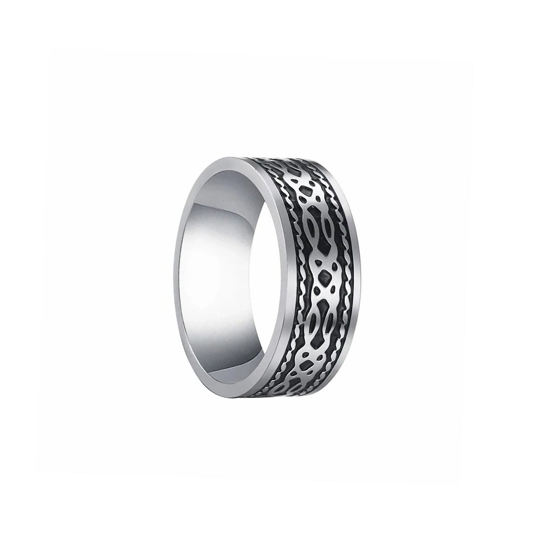 Kiillotettu terässormus on tässä mallissa saanut keskelle sormusta kuvioinnin mienkä molemmin puolin kulkee köysimöinen kuvio. Musta kuviointi antaa miellyttävän kontrastin hopean väriseen sormukseen.
