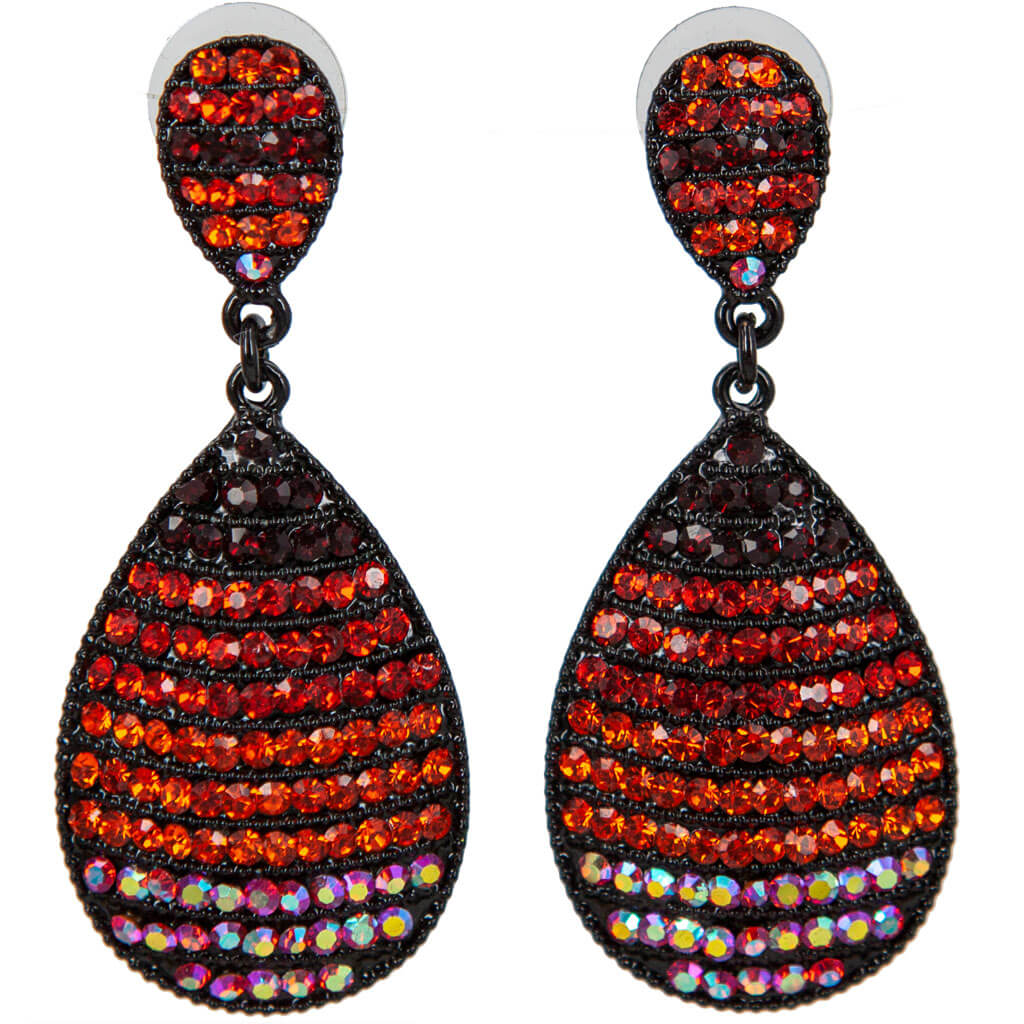 Näyttävä pyöreähkön pisaranmuotoinen juhlakoru. Korussa pohjaväri on musta. Lasiset kivet ovat kolmea sävyä. Pääsävy tuotteessa on tulenpunaisen oranssi. Tuotteen pituus on noin 7cm.