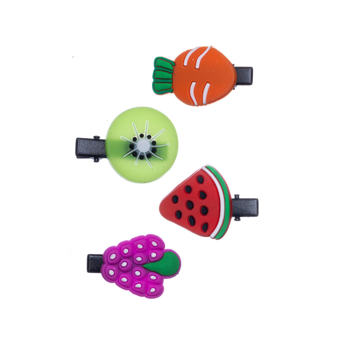 Värikäs hedelmä ja juures teemainen hiusklipsi pakkaus. Neljällä pirteällä hiusklipsillä saat varmasti koristeltua hiukset.