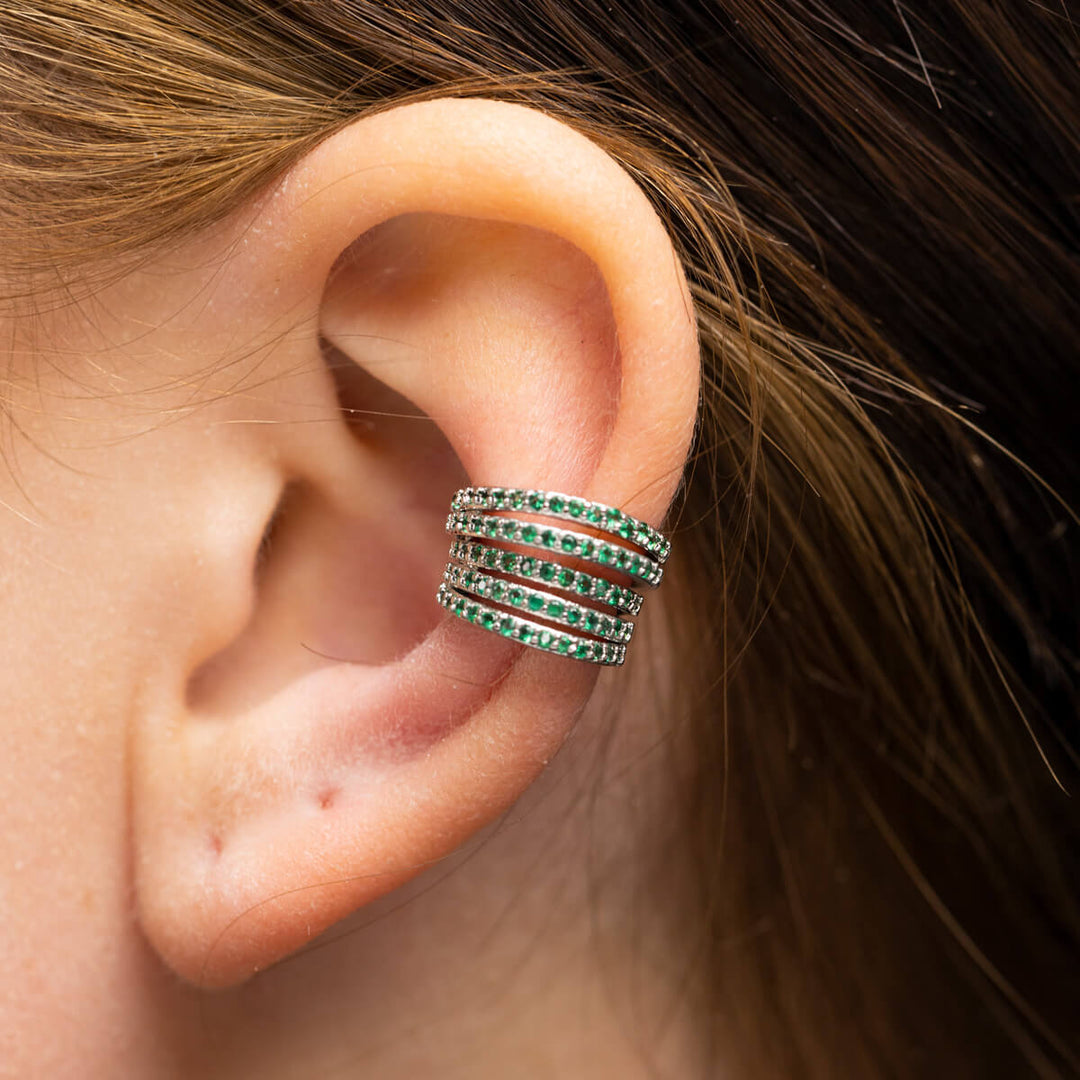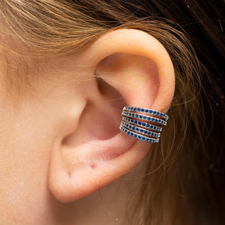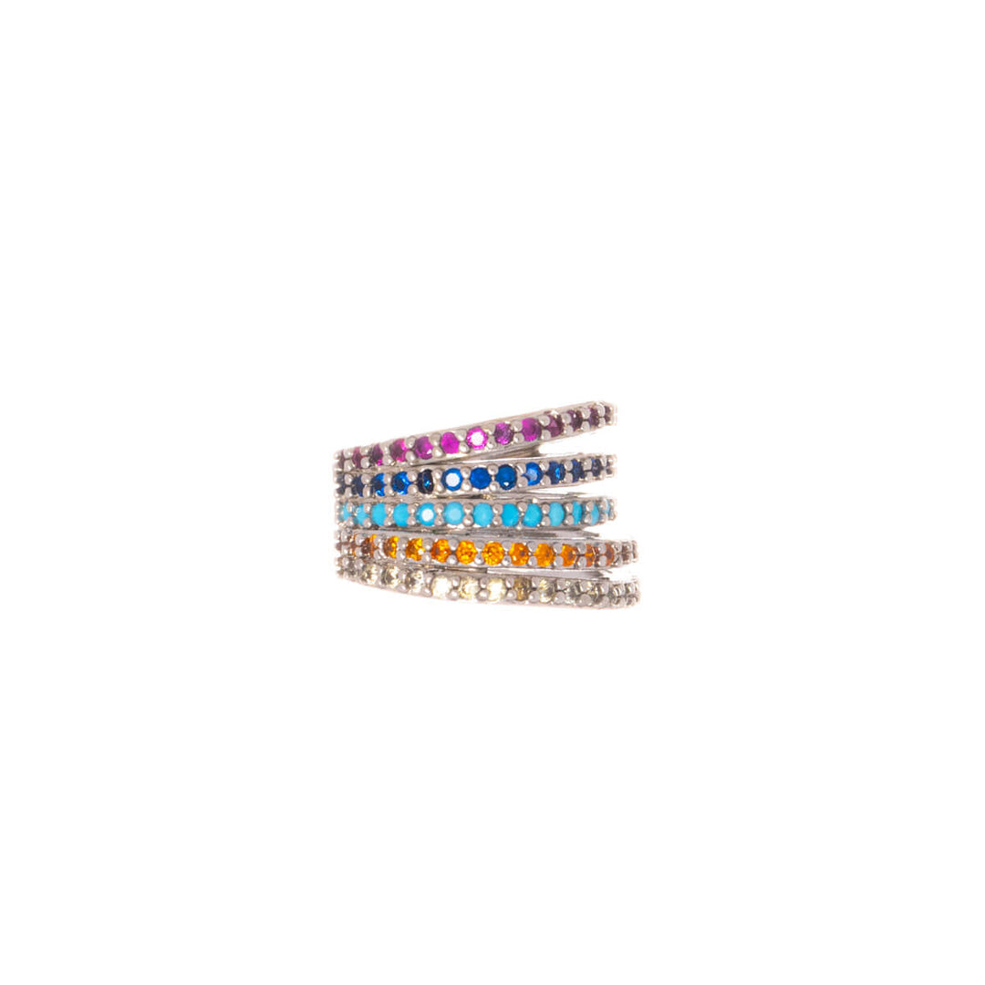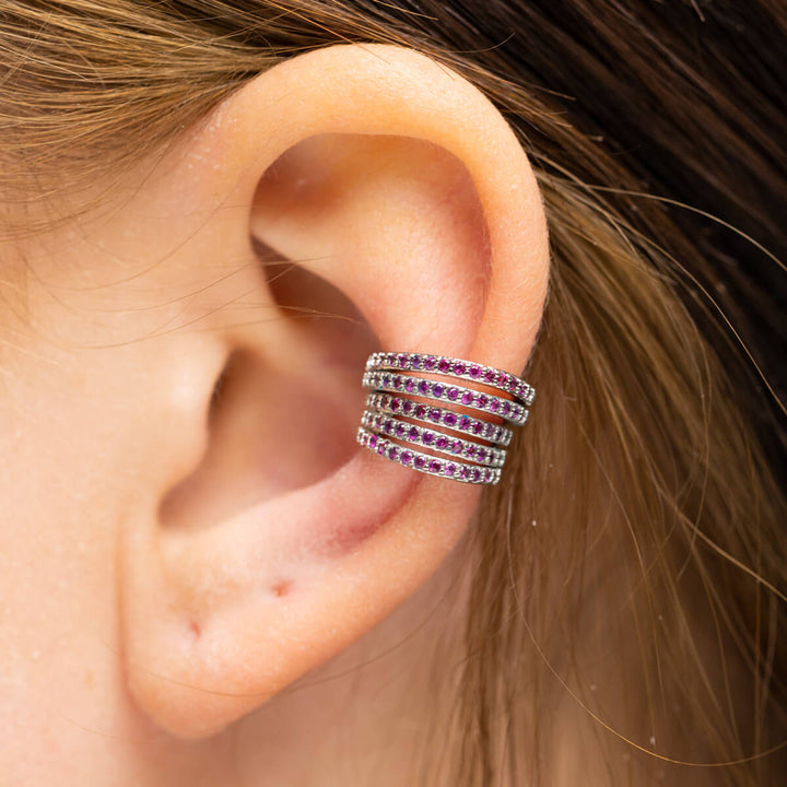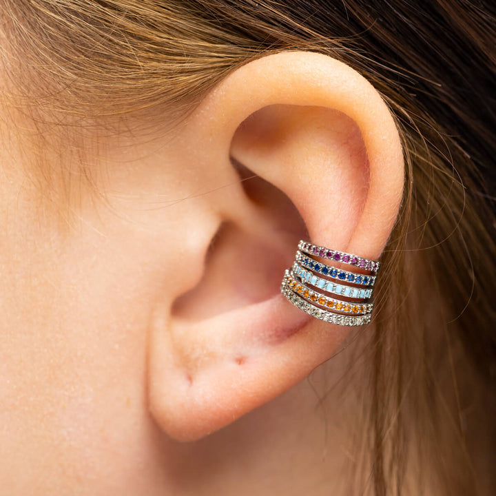 Ear cuff on tyylikäs koru rustoon. Monivärisillä zirkonia kivillä koristeltu viisirivinen rustokoru näkyy varmasti korvasta.