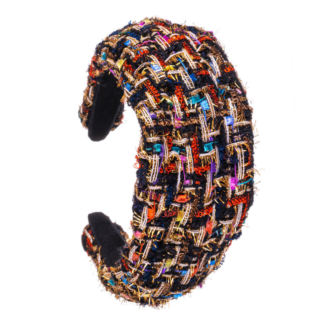 Näyttävä monivärinen hiuspanta on varmasti katseenvangitsija. Ruusukullanvärinen lanka sekä värikkäät punokset tekevät mustasta pannasta trendikkään väripilkun.