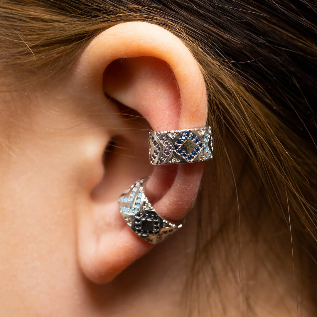 Ear cuff on tyylikäs koru rustoon. Monivärisillä zirkonia kivillä koristeltu leveä rustokoru on helppo yhdistellä eri tyyleihin.