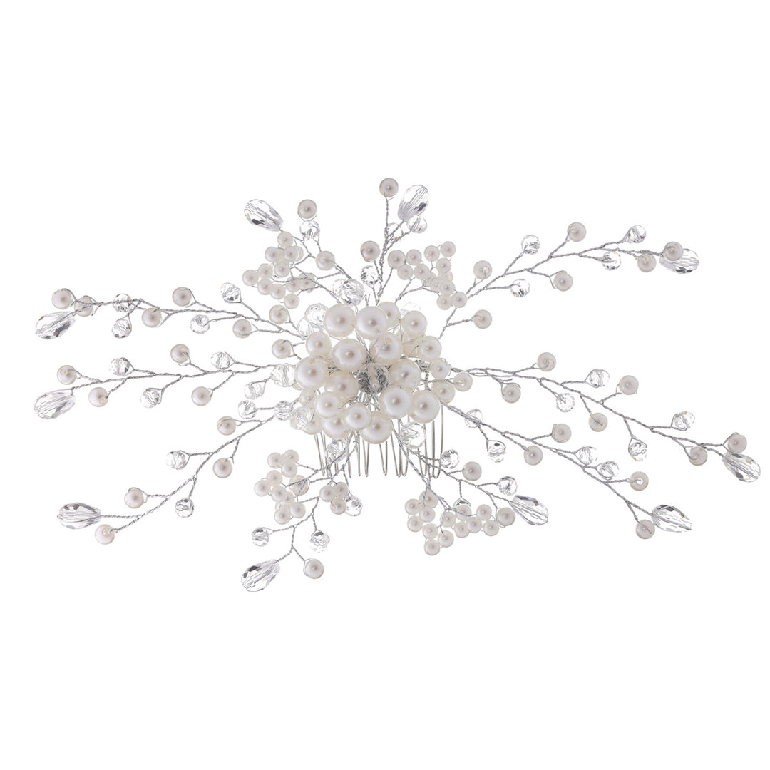 Muotoiltavasta metallipunoksesta rakentuva koriste sivukammassa on näyttävä ja monipuolinen. Viisteiset lasihelmet ja muvoihelmet koristavat tätä kaunista hiuskorua.
