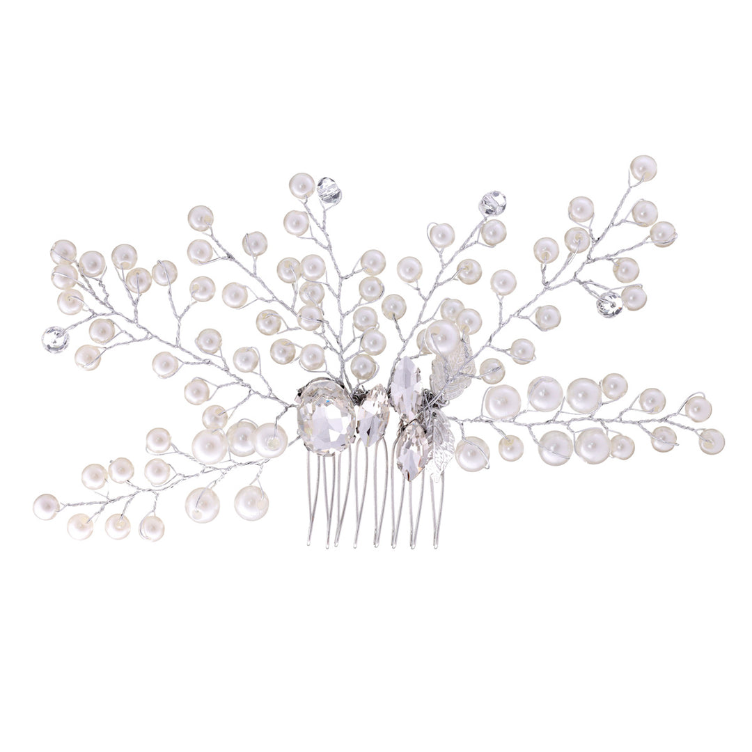 Muotoiltavasta metallipunoksesta rakentuva koriste sivukammassa on näyttävä ja monipuolinen. Metalliset lehdet, viisteiset lasikivet ja muovihelmet koristavat tätä kaunista hiuskorua. Keskellä korua on näyttävät isot lasikivet.