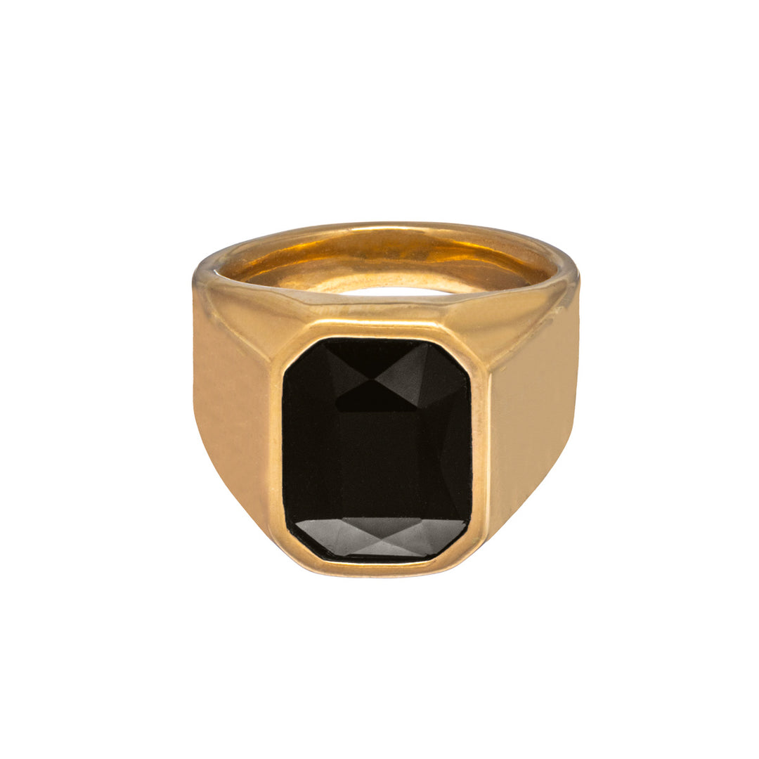 Maskuliininen kantasormus on koristeltu nelikulmioisella mustalla kivellä. Kullattu teräs on laadukas valinta sormukseksi.