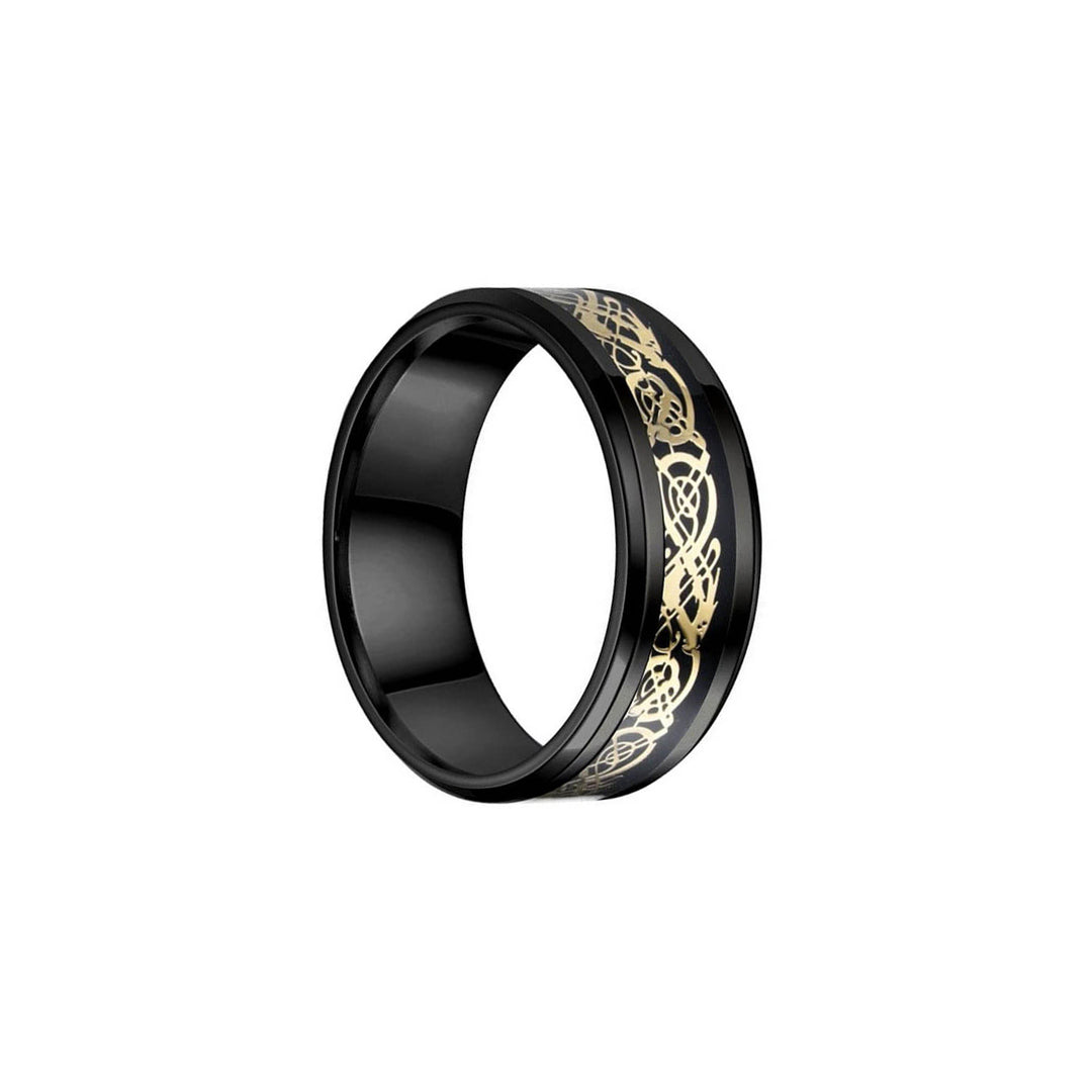Kullanvärinen kuviointi mustassa terässormuksessa tuo tyylikkään yksityiskohdan koruun. Lohikäärmemäinen kuviointi sopii mainiosti niin aikuiselle kuin nuorelle sormukseen.