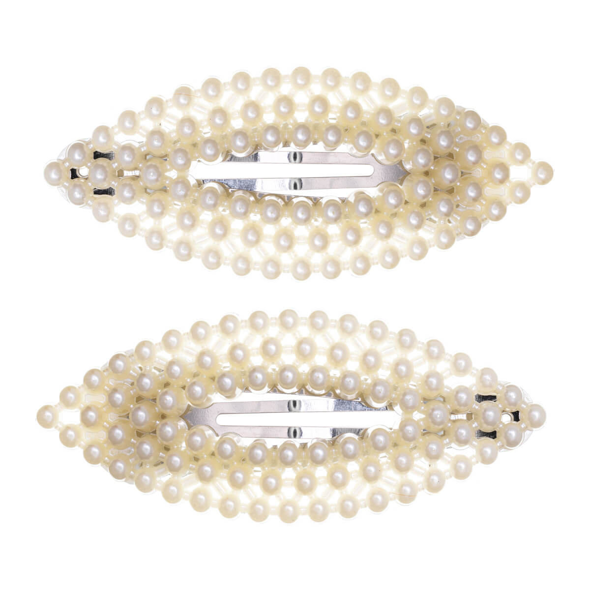 Ovaalin muotoinen helmi hiusklipsi on tyylikäs yksityiskohta. Napakka clik clak pitää sivuhiukset kurissa ja on värikäs piristys kampauksessa.