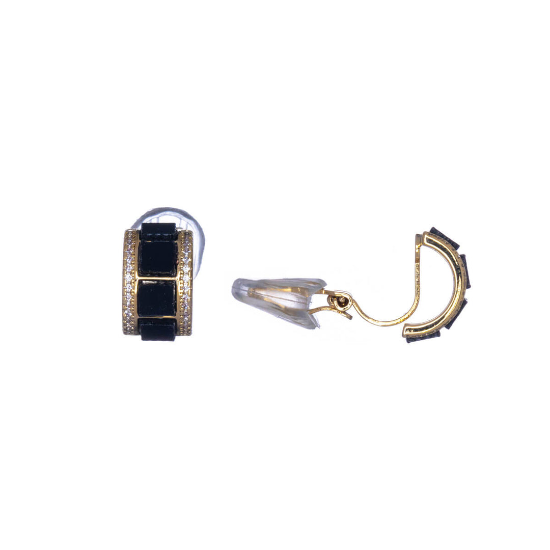 Mustan ja kullanväriset hyvin yksityiskohtaiset korvarenkaat ovat helppo korvakoru. Sirot zirkonia rivistöt reunustavat mustaa lasikivi rivistöä korun keskellä.
