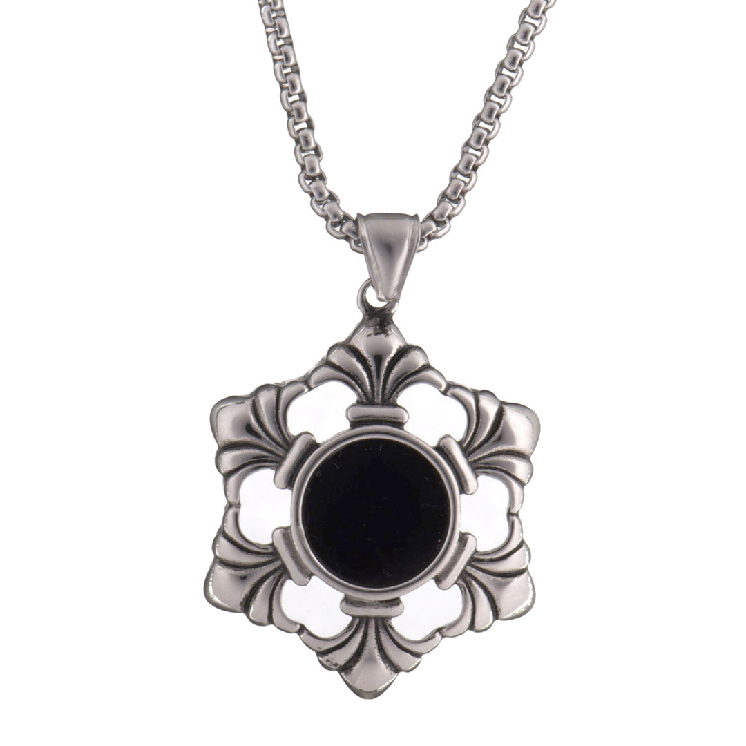 Teräksinen pyöreä riipus on kuvioitu yksityiskohtainen koru. Teräs on elinikäinen materiaali - se ei kulu.