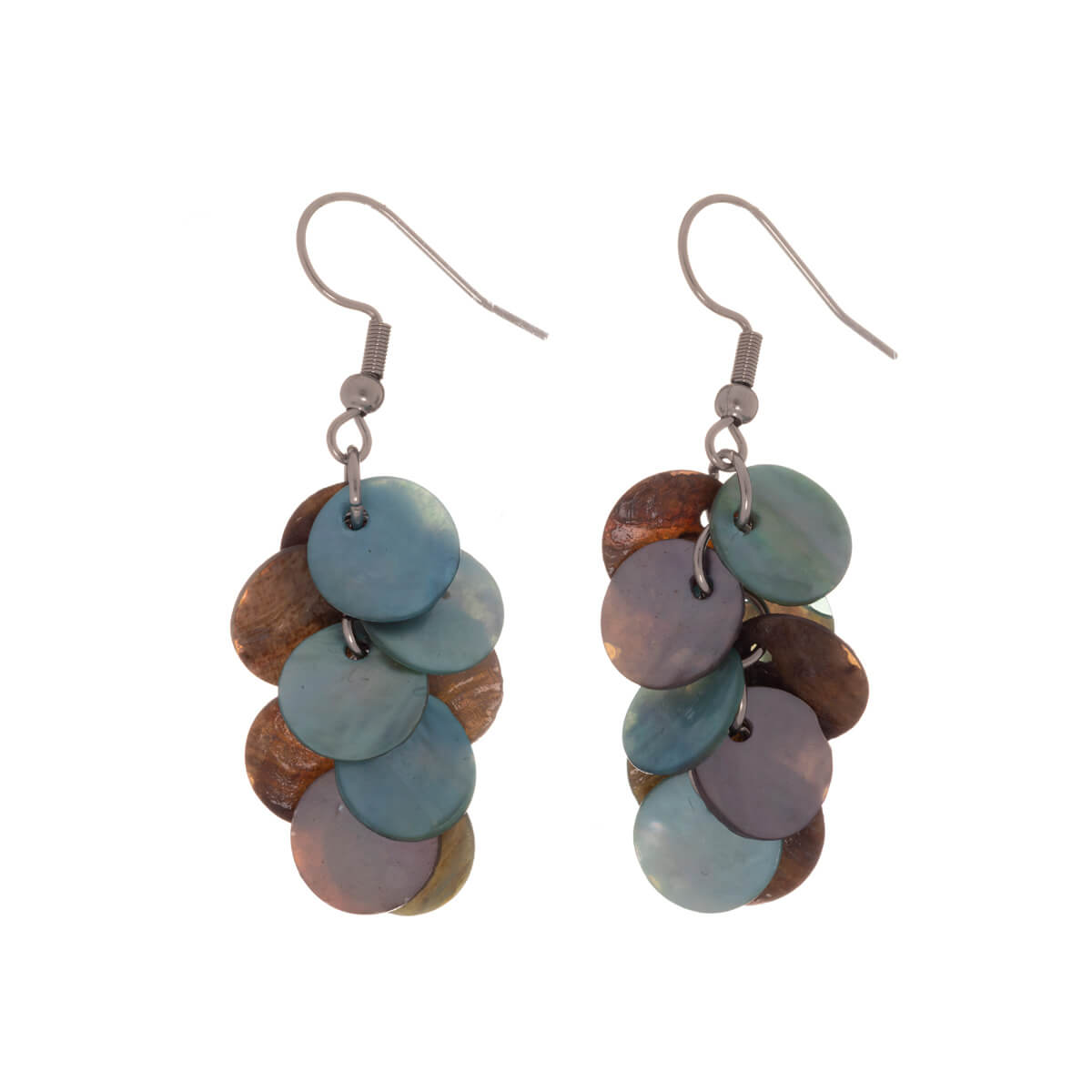 Kevyet rypälekorvakorut ovat kasattu teräksiseen runkoon simpukka helmistä. Litteät simpukkahelmet taittavat kauniisti väriä.