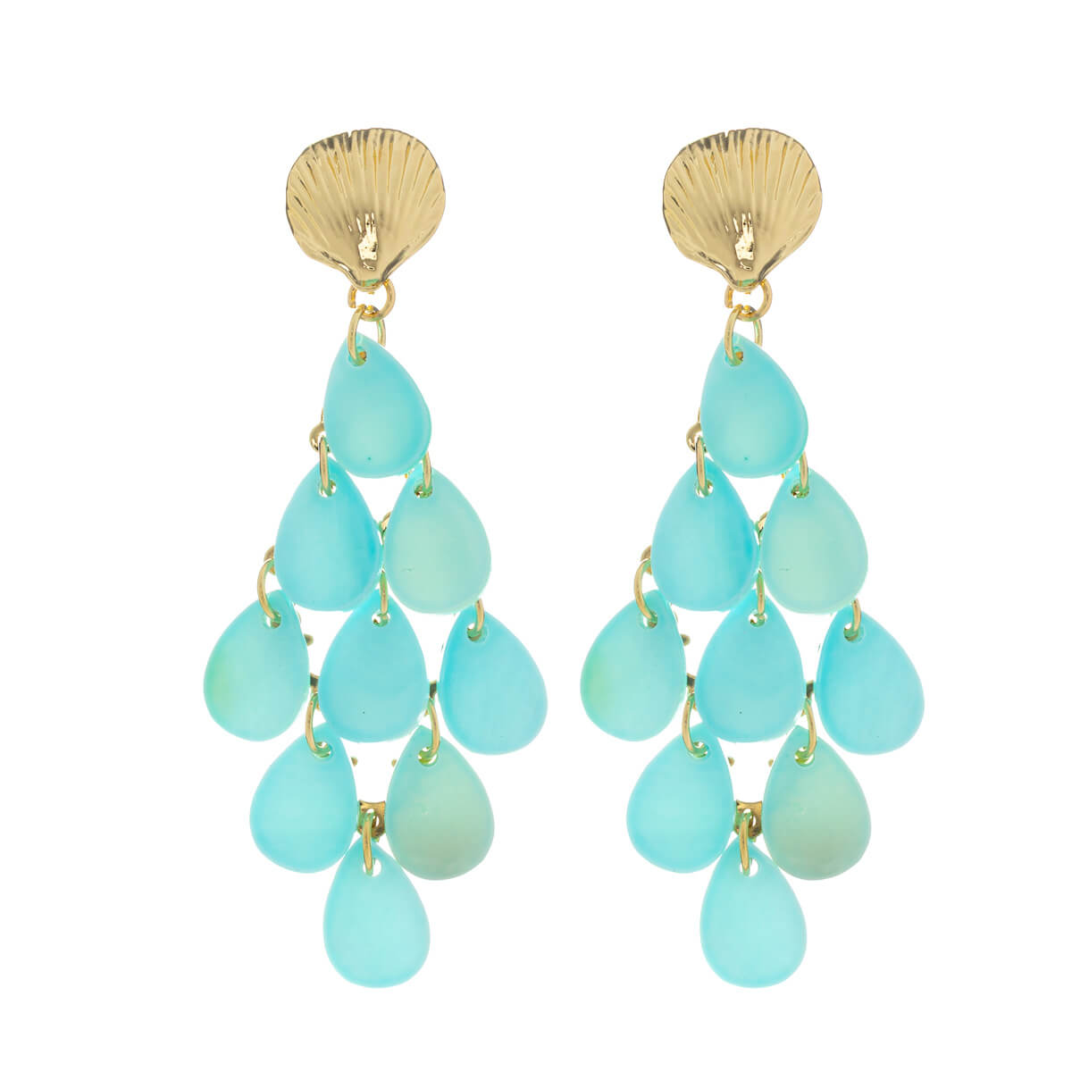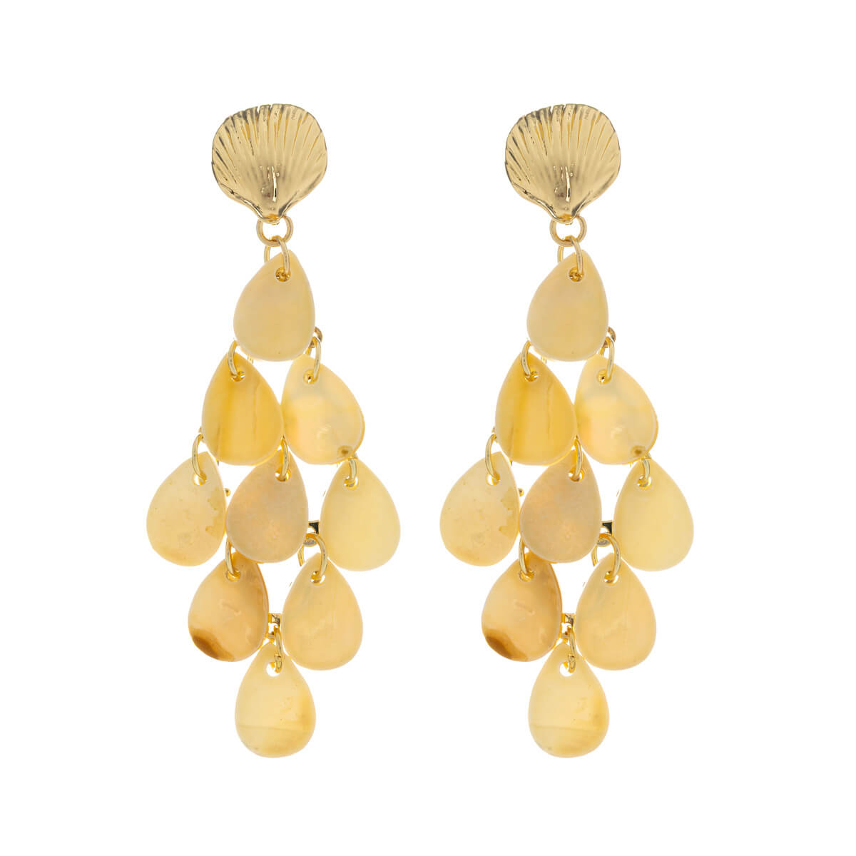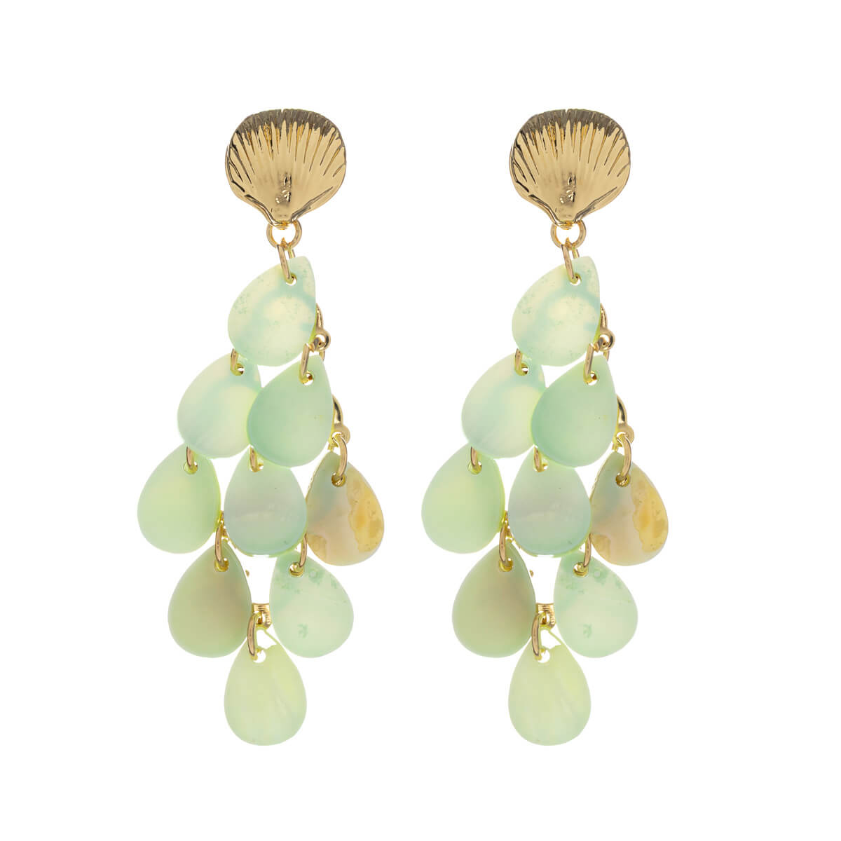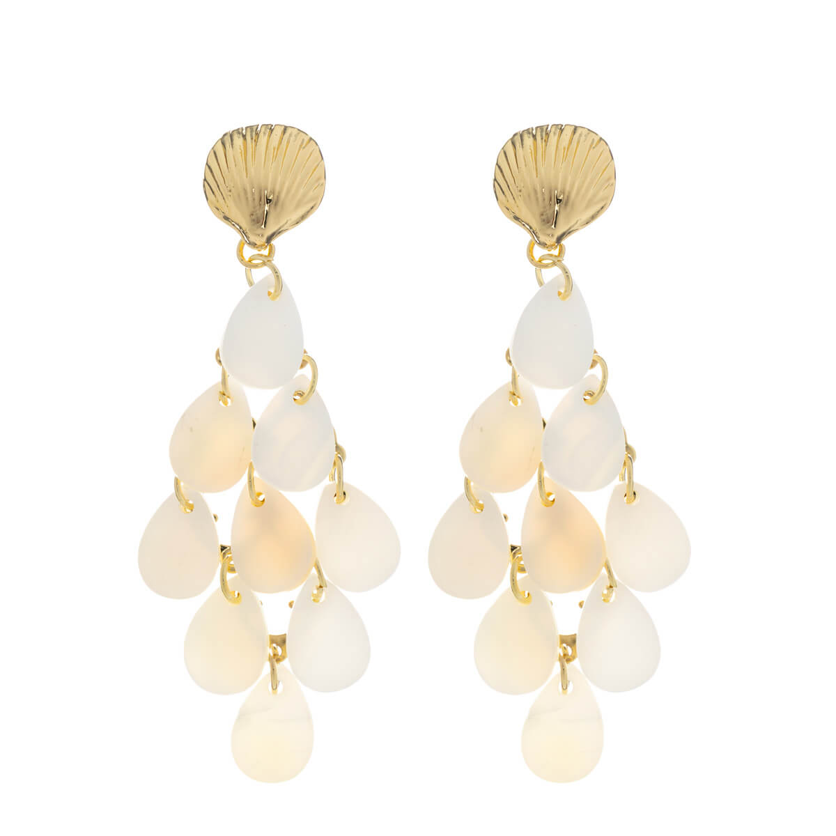 Kauniit litteät pisaranmuotoiset simpukka riipukset koristavat tätä ruudun muotoista korvakorua. Tämä korvakoru tuo mieleen kesän ja hiekkarannat.
