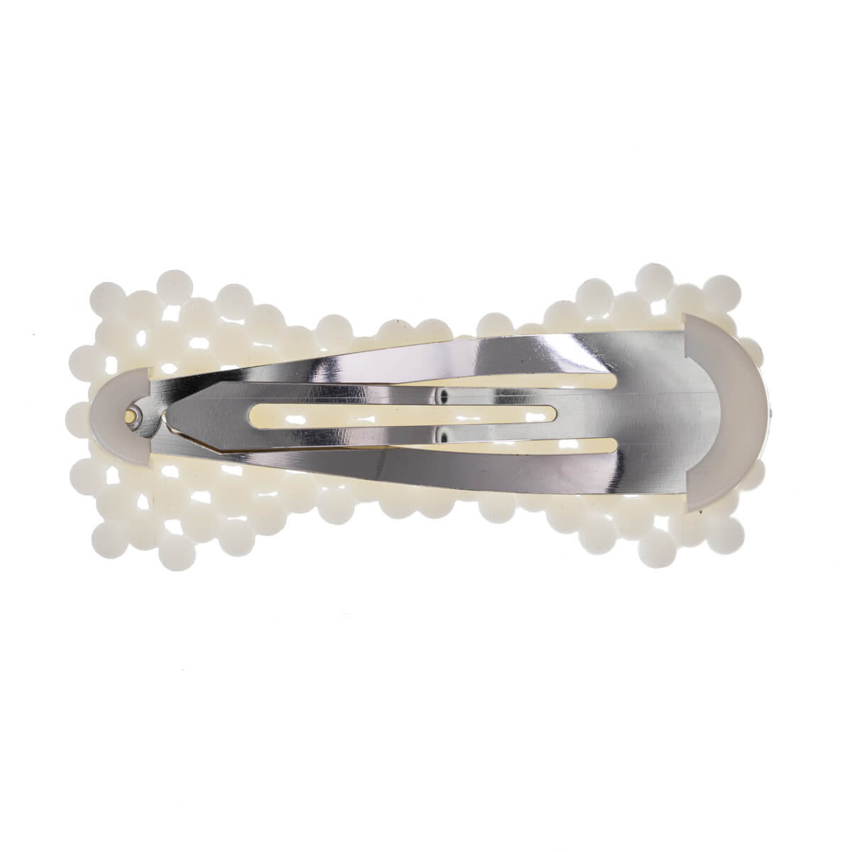 Rusetin muotoinen helmi hiusklipsi on tyylikäs yksityiskohta. Napakka clik clak pitää sivuhiukset kurissa ja on värikäs piristys kampauksessa.