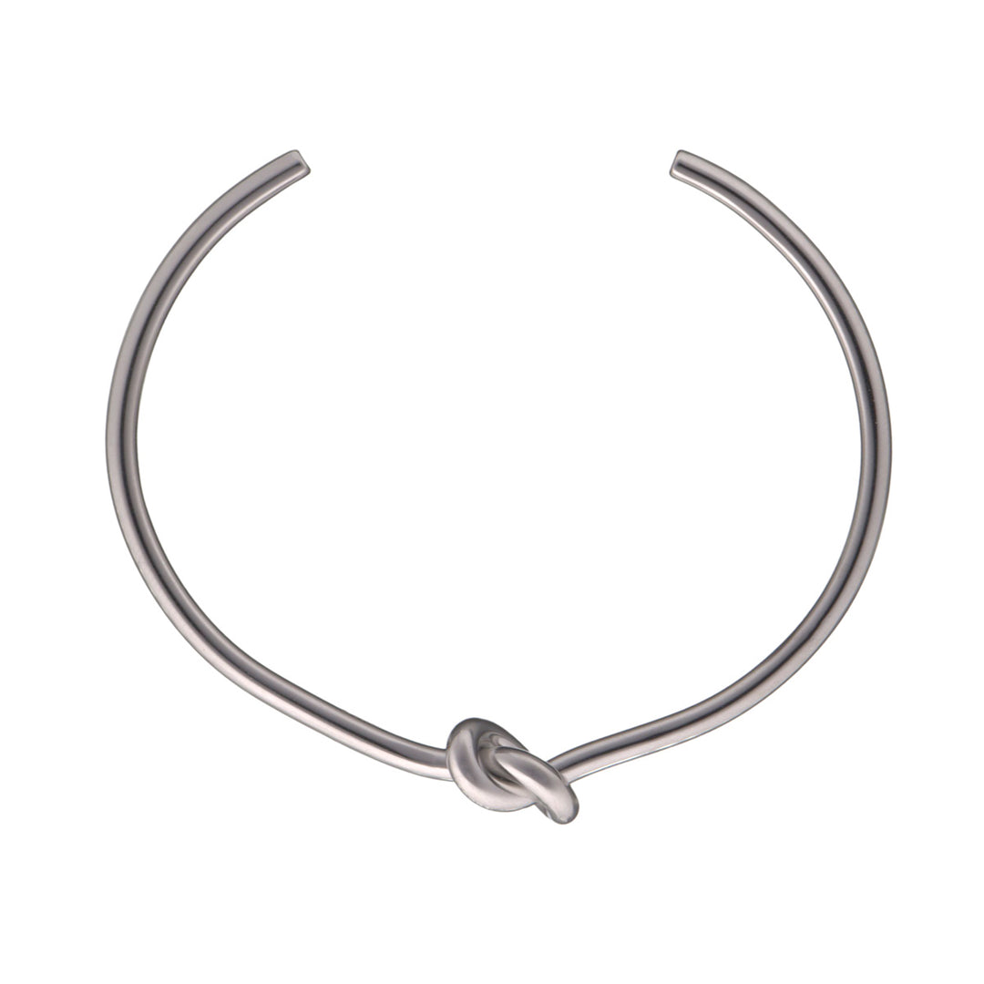 Simppeli pujotettava rannerengas on helppo laittaa käteen. Kiillotettu teräs kiiltää mukavasti valossa.