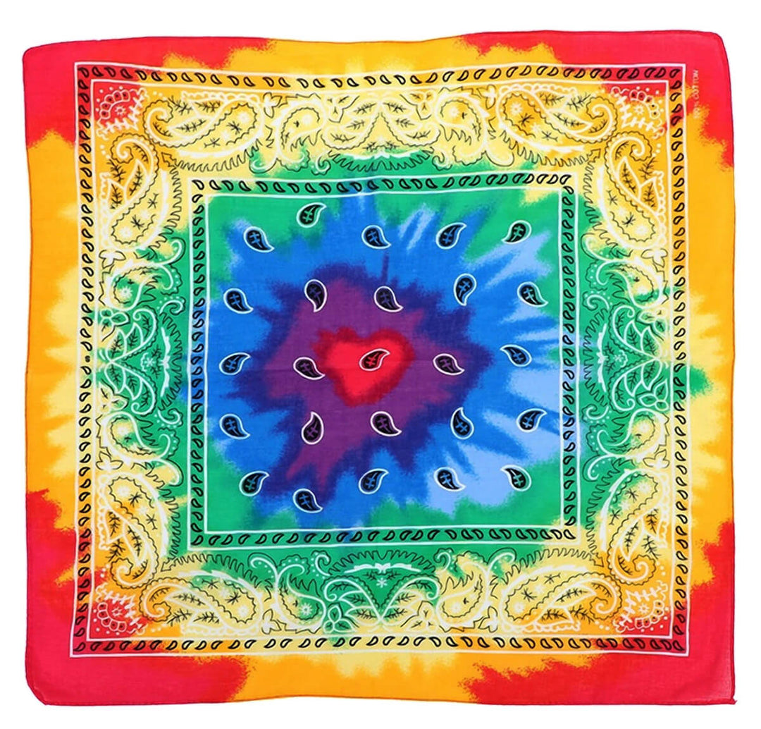 60- ja 70-lukujen klassikko kuosi, batiikkikuvio, antaa kankaalle aivan uuden ilmaan. Usein solmuvärjäyksellä tehtyä kuvio on hyvin eloisa. Jenkkihuivi eli bandana on 100% puuvillaa ja kooltaan 56x56cm.