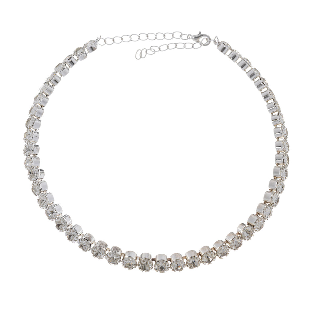 Kirkkaista lasikivistä rakennettu korusetti on helppo ratkaisu juhla-asusteeksi. Kaulakorussa, rannekorussa ja korvakorussa on yksi rivi lasikiviä.