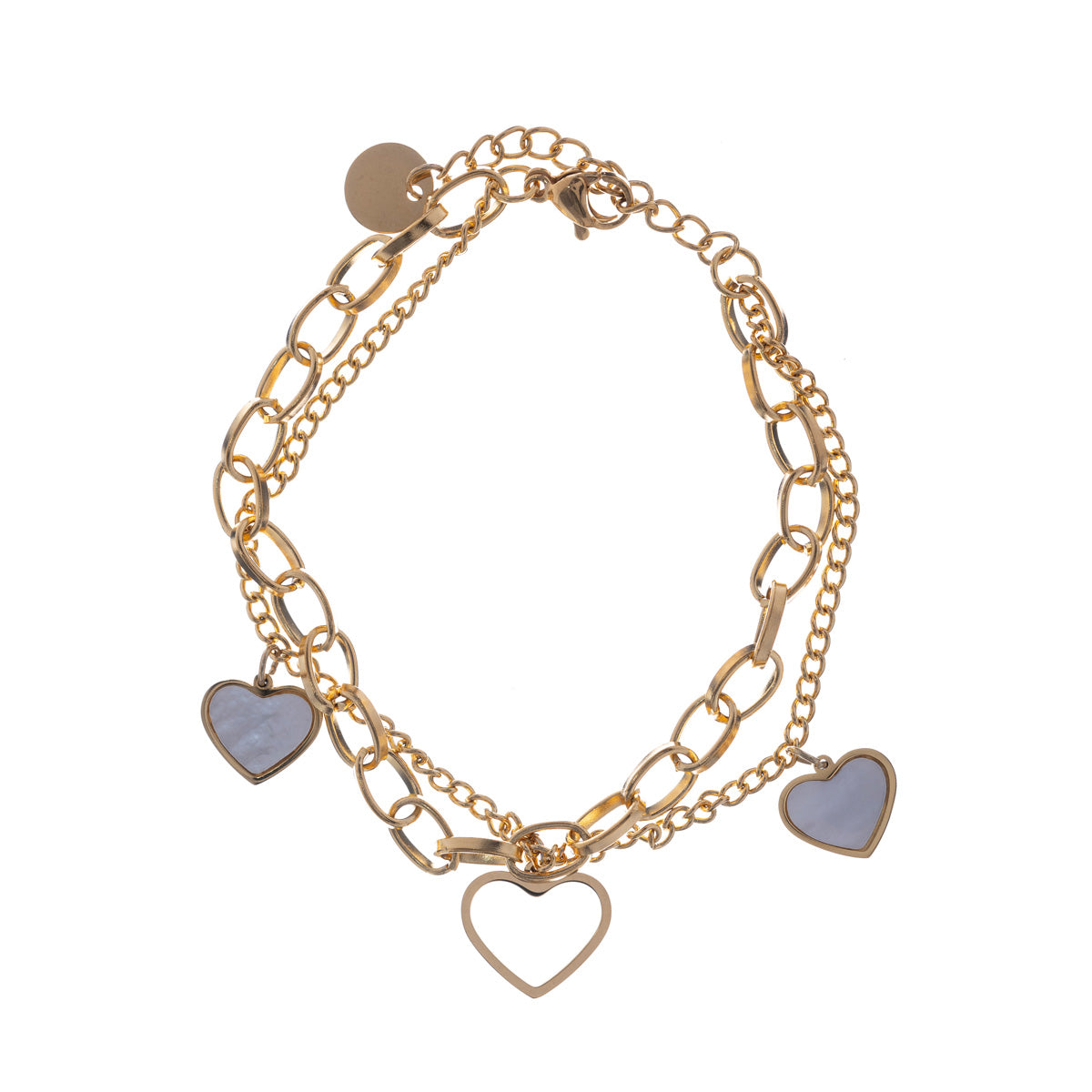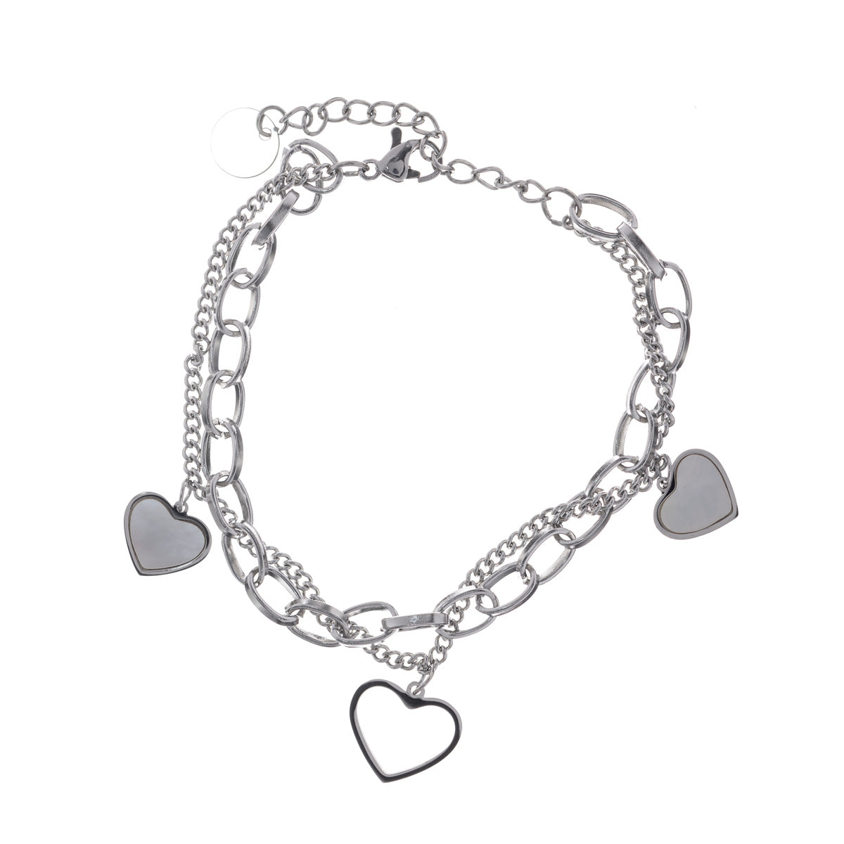 Kaksi ketjua tekee tästä rannekorusta runsaan. Sydämet riipuksina koristavat korua ihanasti.