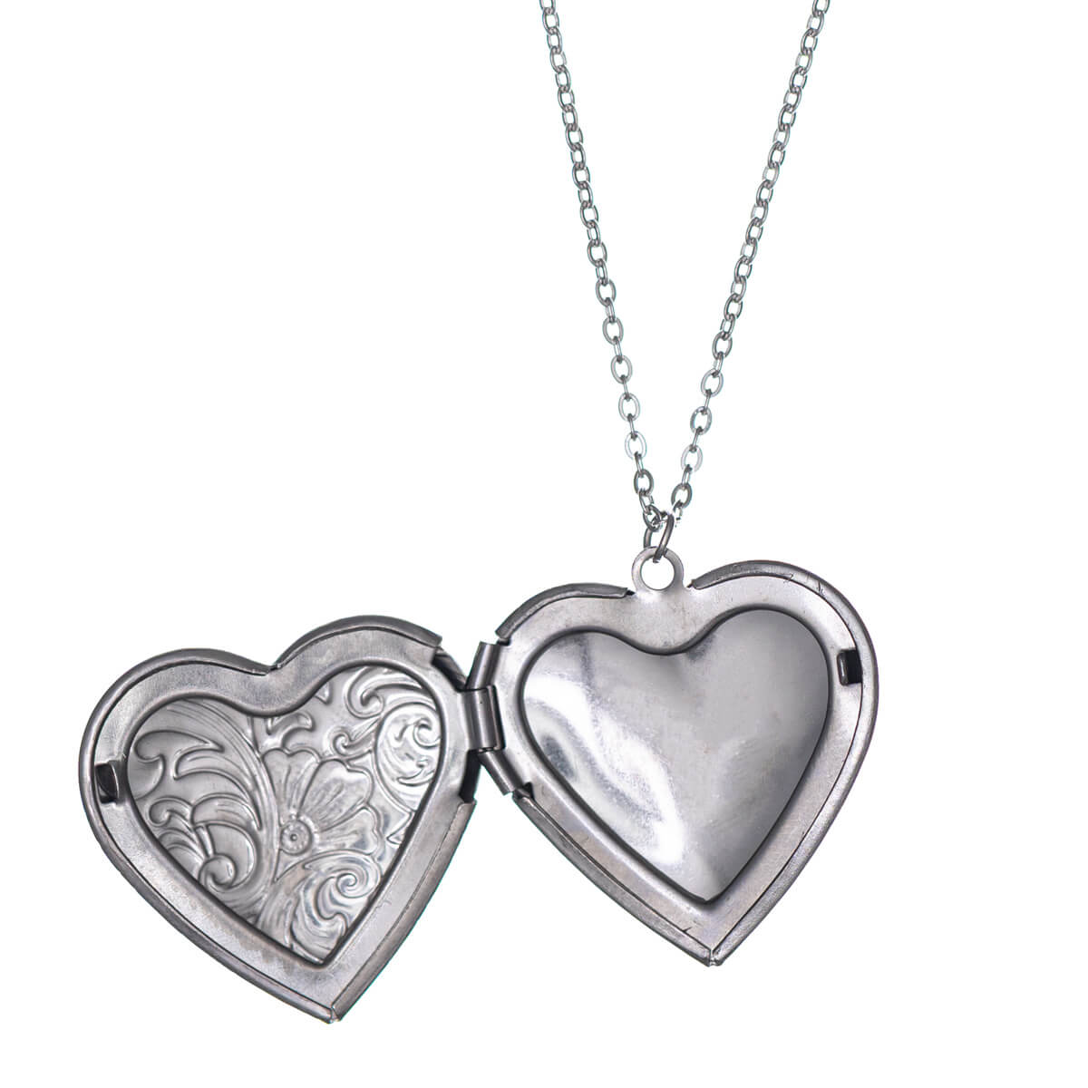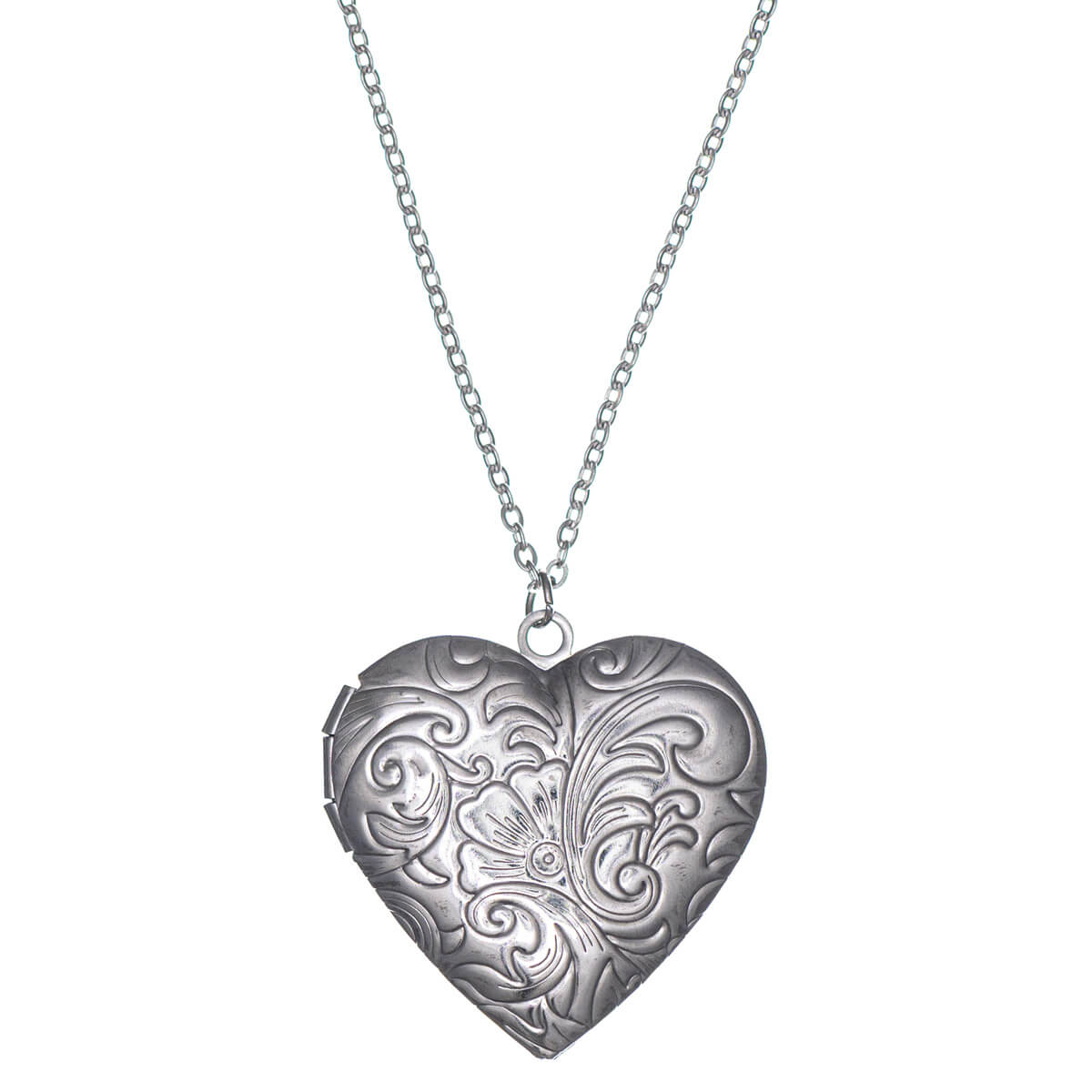 Ihanasti kuvioitu sydämenmuotoinen medaljonki on täydellinen koru jokapäiväiseen käyttöön. Sydän riipus aukeaa saranalla. Kaulakoru on valmistettu kokonaan turvallisesta kirurginteräksestä.