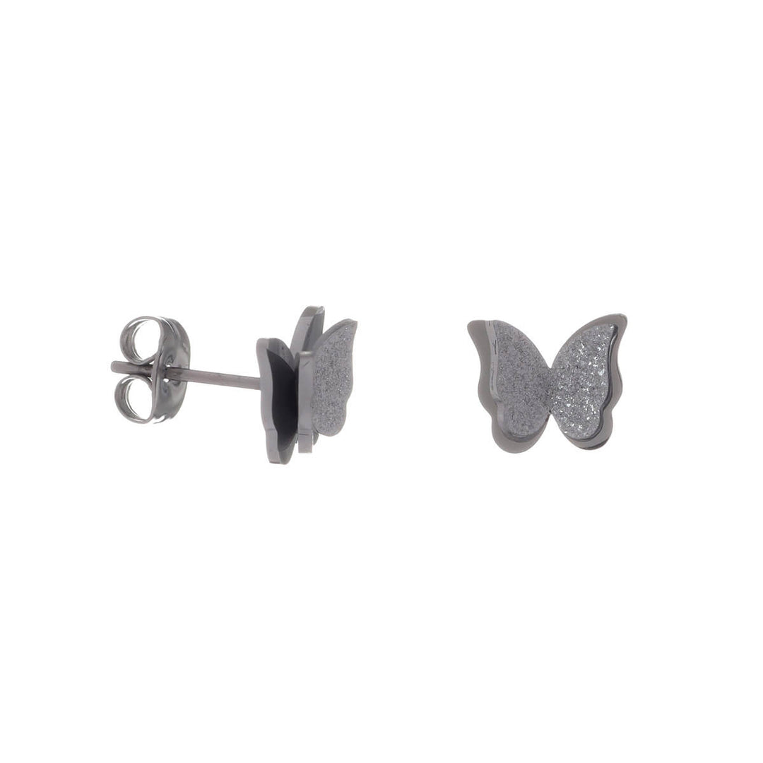 Siro kimaltava perhonen on tarpeeksi pieni korvakoru arkiseen käyttöön. Alempi siipi on kiillotettua terästä ja ylempi siipi kimaltavaa pintaa teräksessä.